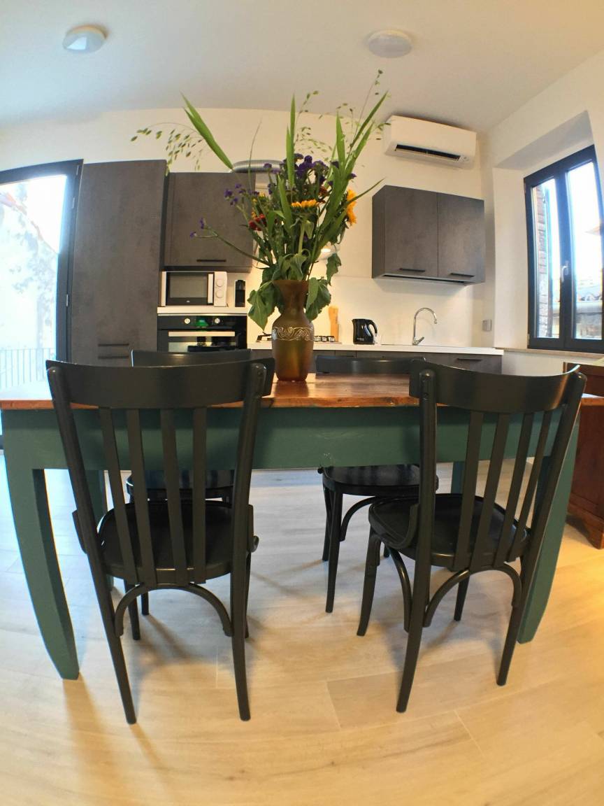 Wohnküche (25 m²): gut ausgestattete Küche, Esstisch (Personen: 6), Spülmaschine, Kühlschrank, Tiefkühler, Mikrowelle, Herd, Ofen, Bügeleisen, Italienische Kaffeemaschine, Sofa (Personen: 3), WiFi Internet, Klimaanlage, Kinderhochstuhl, TV, Rauchmelder, CO2 Detektor, Ausgang auf die Terrasse.