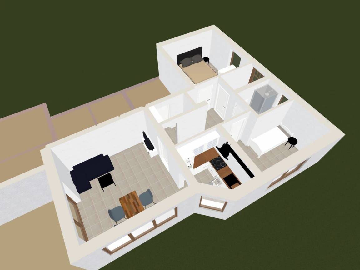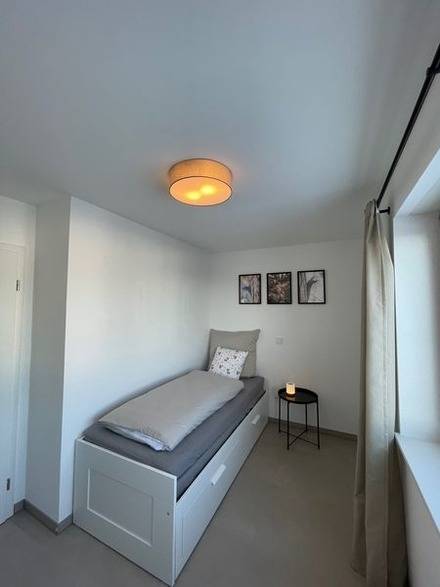 - 1x Schlafzimmer mit ausziehbarem Einzelbett (Einzelbett 80 x 200 cm, ausgezogen 160x 200 cm). Das Zimmer ist eine kleine Kuschelhöhle aber auch mit 2 Jugendlichen Erwachsenen bewohnbar.