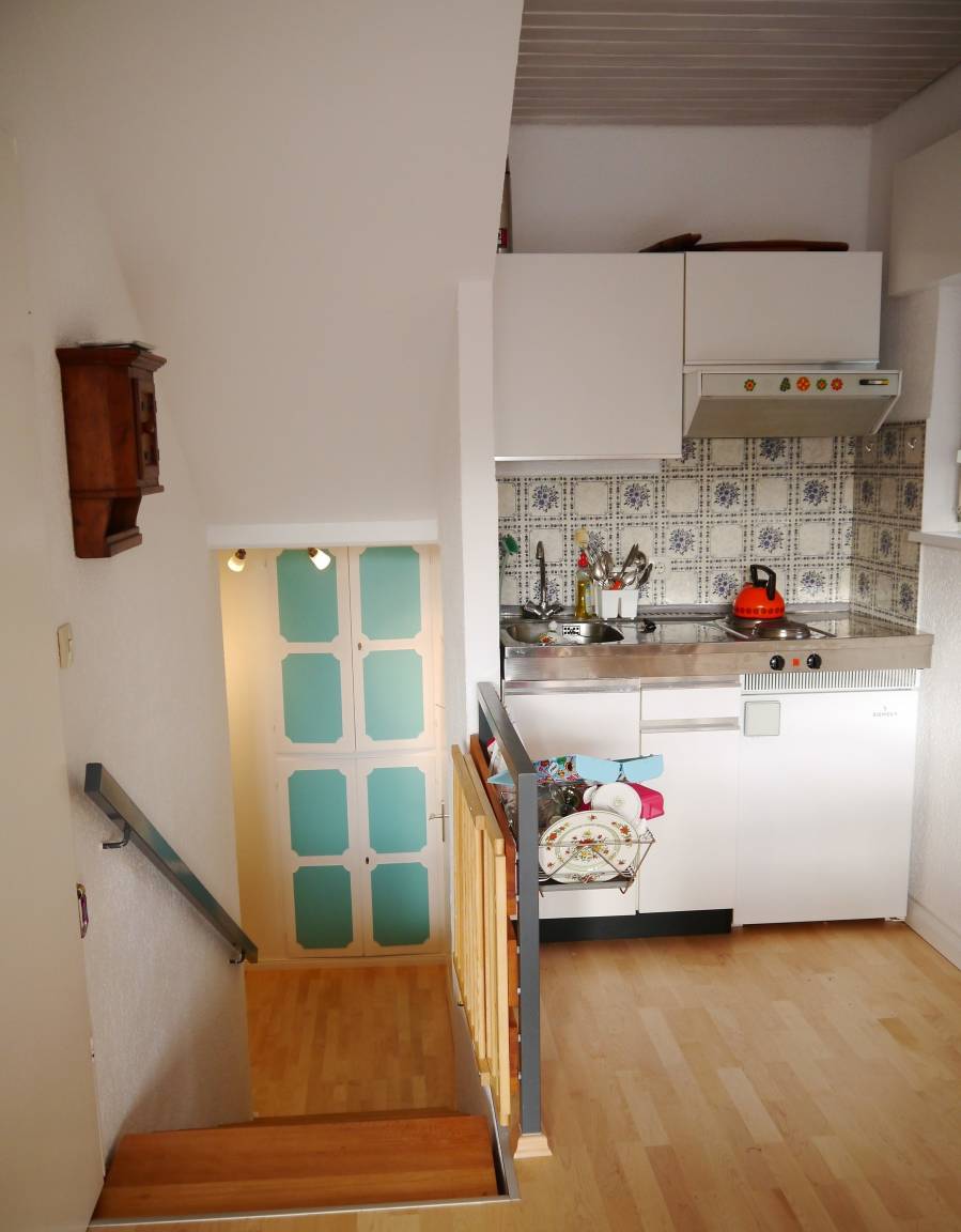 Die Wohnung erstreckt sich über 2 Etagen. Oben befindet sich ein großer Küchen-/Wohn-/ Ess-Bereich mit Schlafcouch (1,40 m) sowie der Balkon.