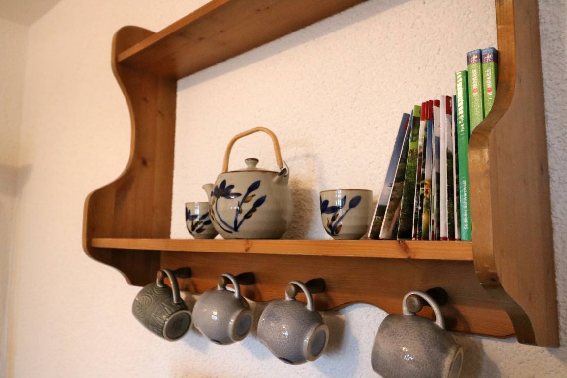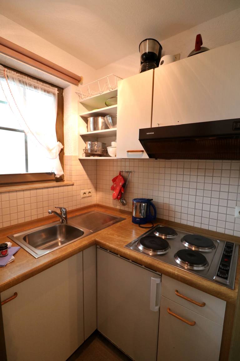 Die komplett ausgestattete Küche verfügt über einen Herd mit 4 Kochfeldern, einen Kühlschrank, eine Kaffeemaschine, einen Toaster und einen Wasserkocher.