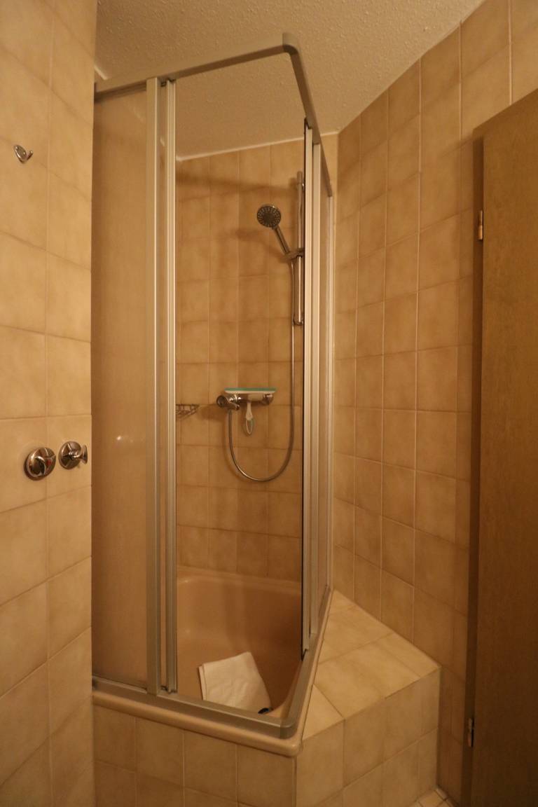Das Badezimmer ist gepflegt, hat eine Dusche, Waschbecken und WC.