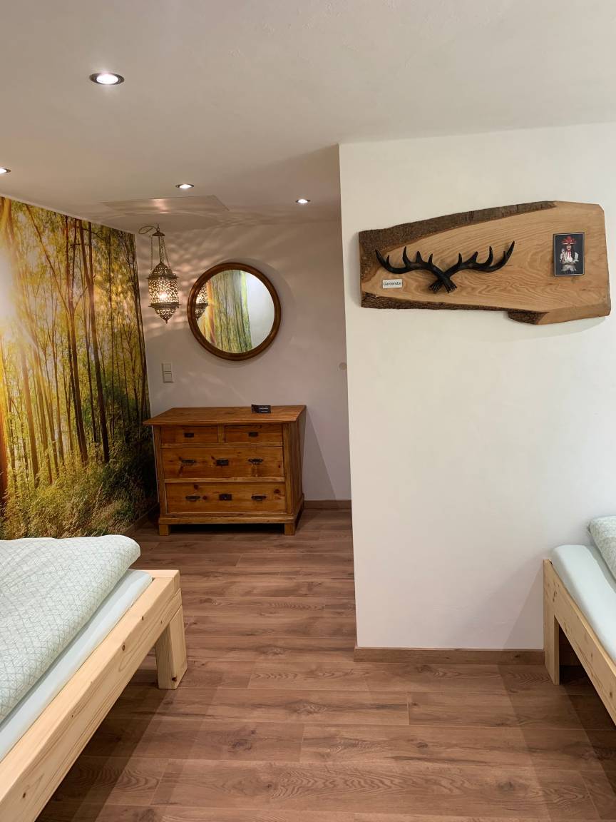 - ein Schlafzimmer außerhalb der Wohnung im EG mit zwei Einzelbetten sowie Dusche und WC (extra Raum im Zimmer).
