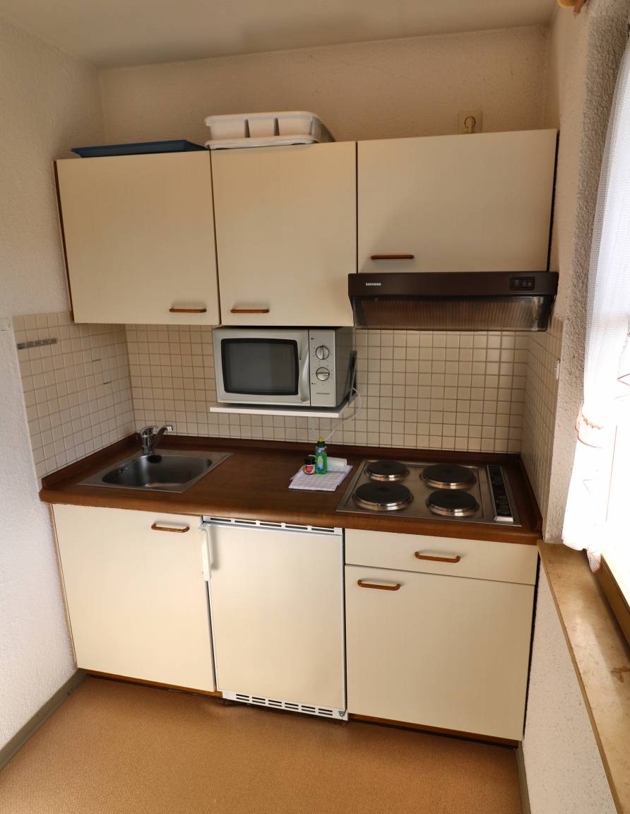 - Küche mit Herd, Kühlschrank mit Gefrierfach, Mikrowelle, Toaster, Wasserkocher und Küchengrundausstattung