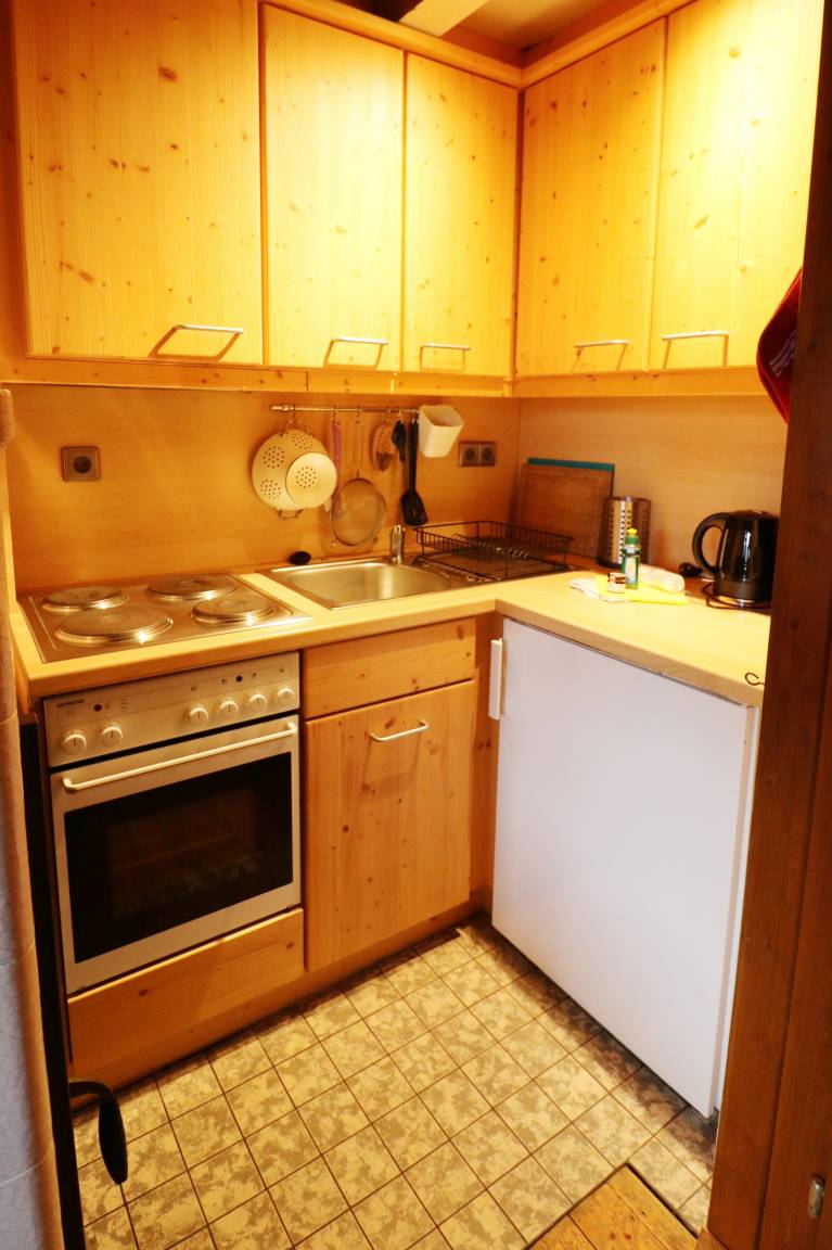 - Eine Offene Küche im Wohnbereich mit Herd (4 Kochfelder), Backofen, Kühlschrank mit Gefrierfach, Filterkaffeemaschine, Wasserkocher sowie Küchengrundausstattung