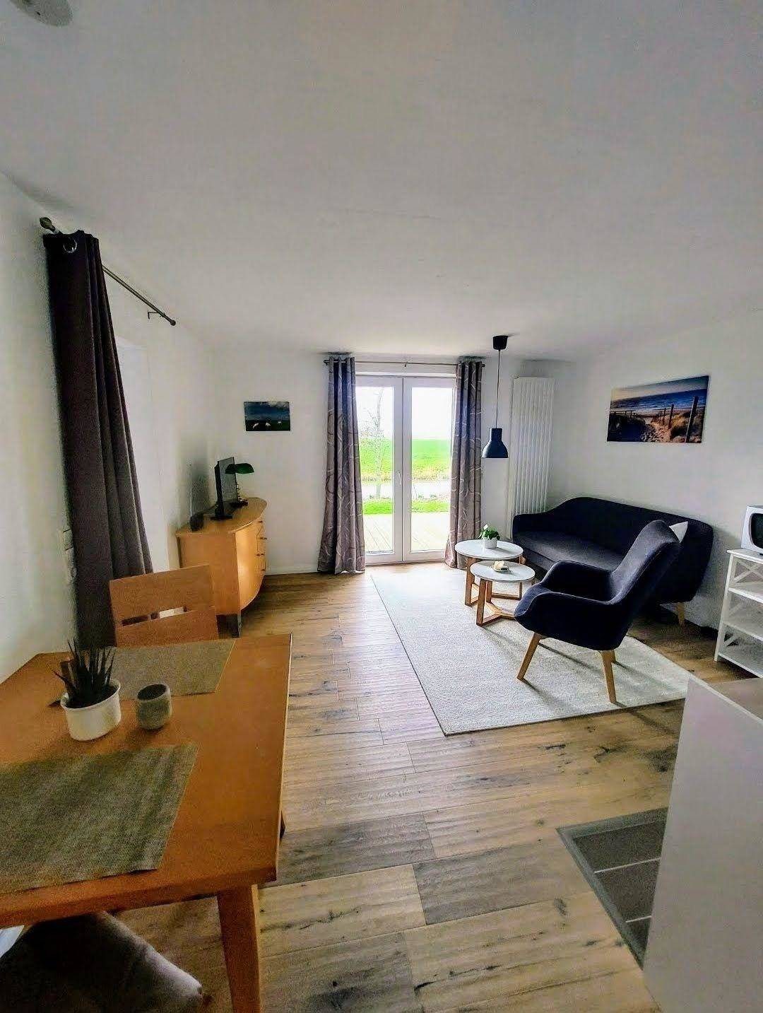 Unsere „Marschblickwohnung" liegt am parkähnlichen Garten, an der Weide und an der „Bootfahrt", dem Handels- und Entwässerungskanals. Sie hat zwei Terrassen, eine zum Kanal ausgerichtet und eine kleinere überdachte Terrasse zur Rückseite, dem Eingang.