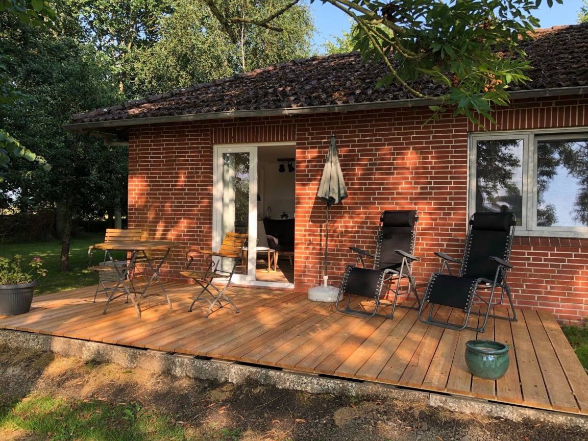 Zwei Terrassen direkt im Grünen. Eine Holzdielenterrasse zum Kanal „Süderbootfahrt" und eine gepflasterte, überdachte Terrasse zum Apfelgarten ausgerichtet.