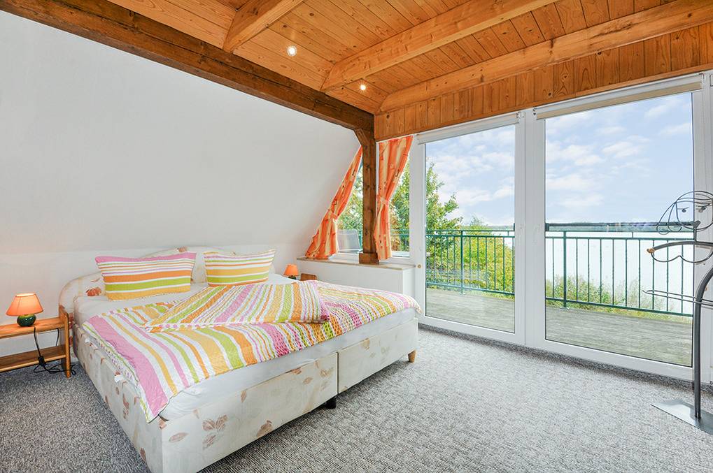 D 46.191 Ferienhaus 2-4 Pers.: 3-Zimmerhaus mit 86 qm Wohnfläche über zwei Etagen. Parterre: Großzügiger Wohn-/Essraum mit Couchgarnitur, Flachbild-TV, Radio/CD, weiterer Sitzecke, Esstheke mit Blick auf den See, Küchenzeile (Backofen, Mikrowelle). Bad: Du, Wb, WC. 1. Etage (leichte Schrägen): Großes Doppelzimmer mit Panoramafenstern zum See, Balkon (Sitzmöbel). 2-Bettzimmer mit 2 Einzelbetten, kleiner Sitzecke, TV. Separates WC.
