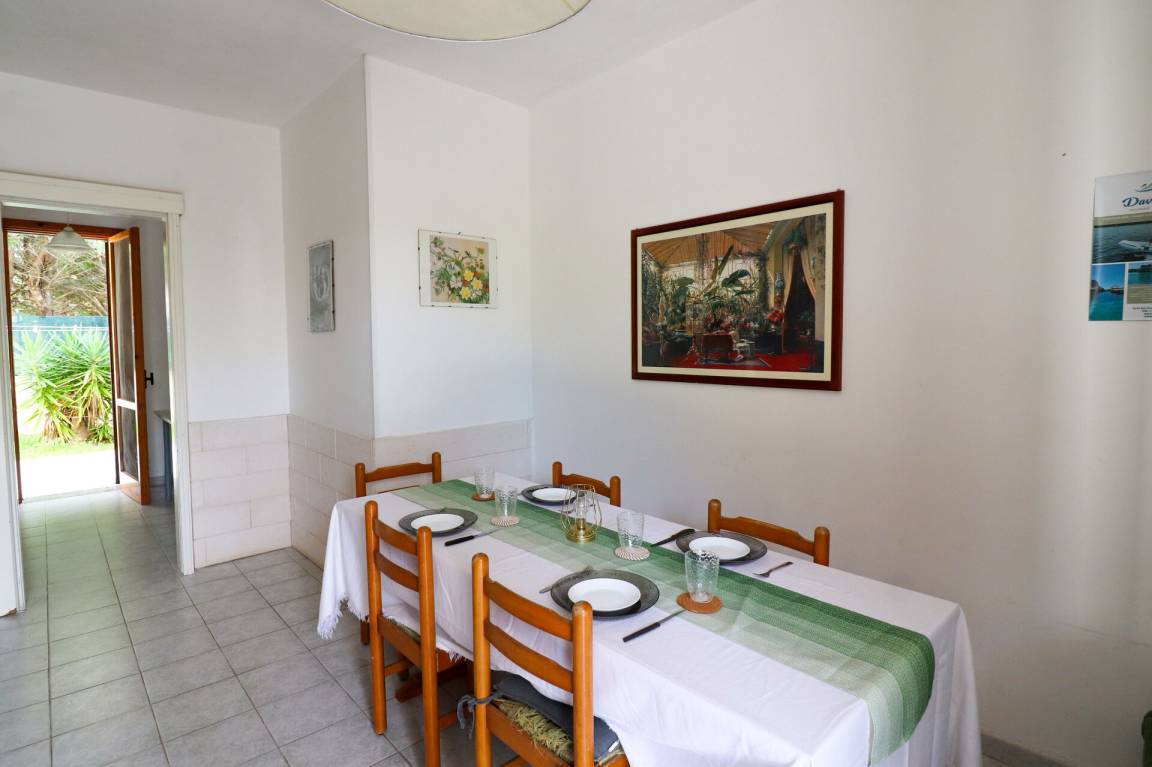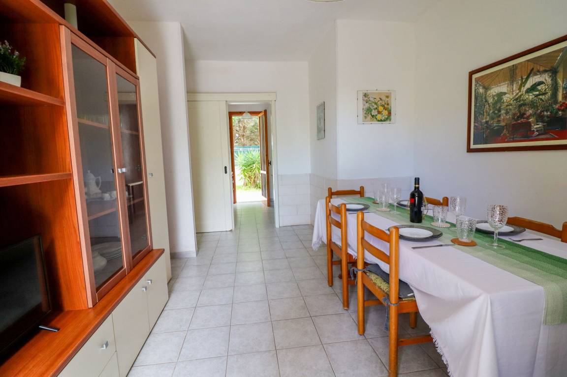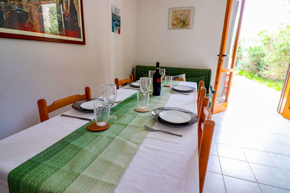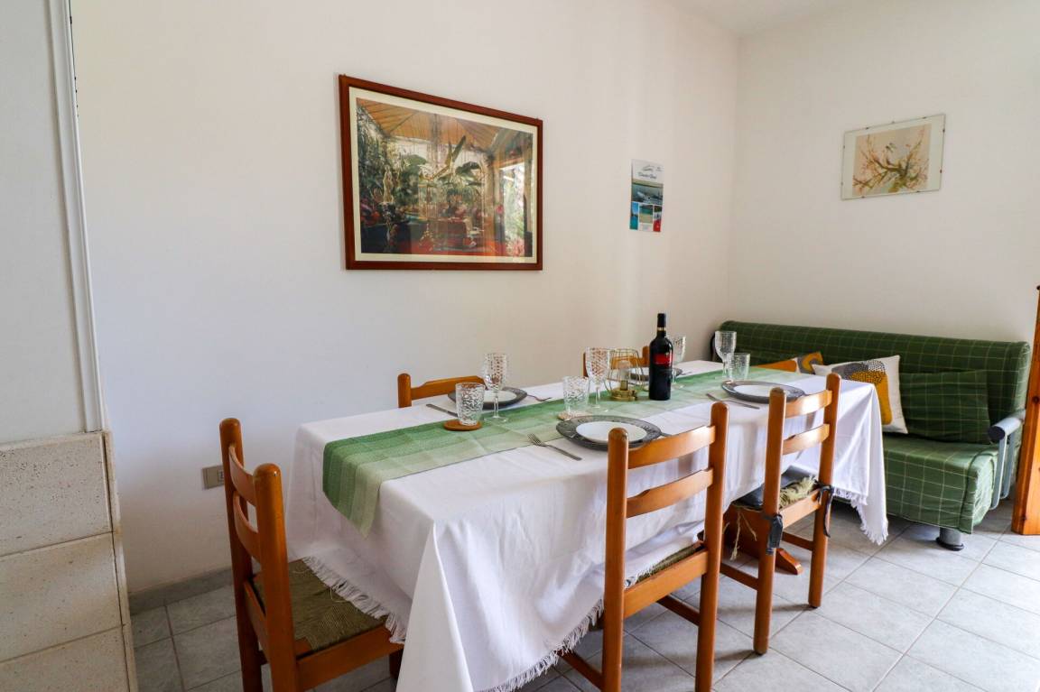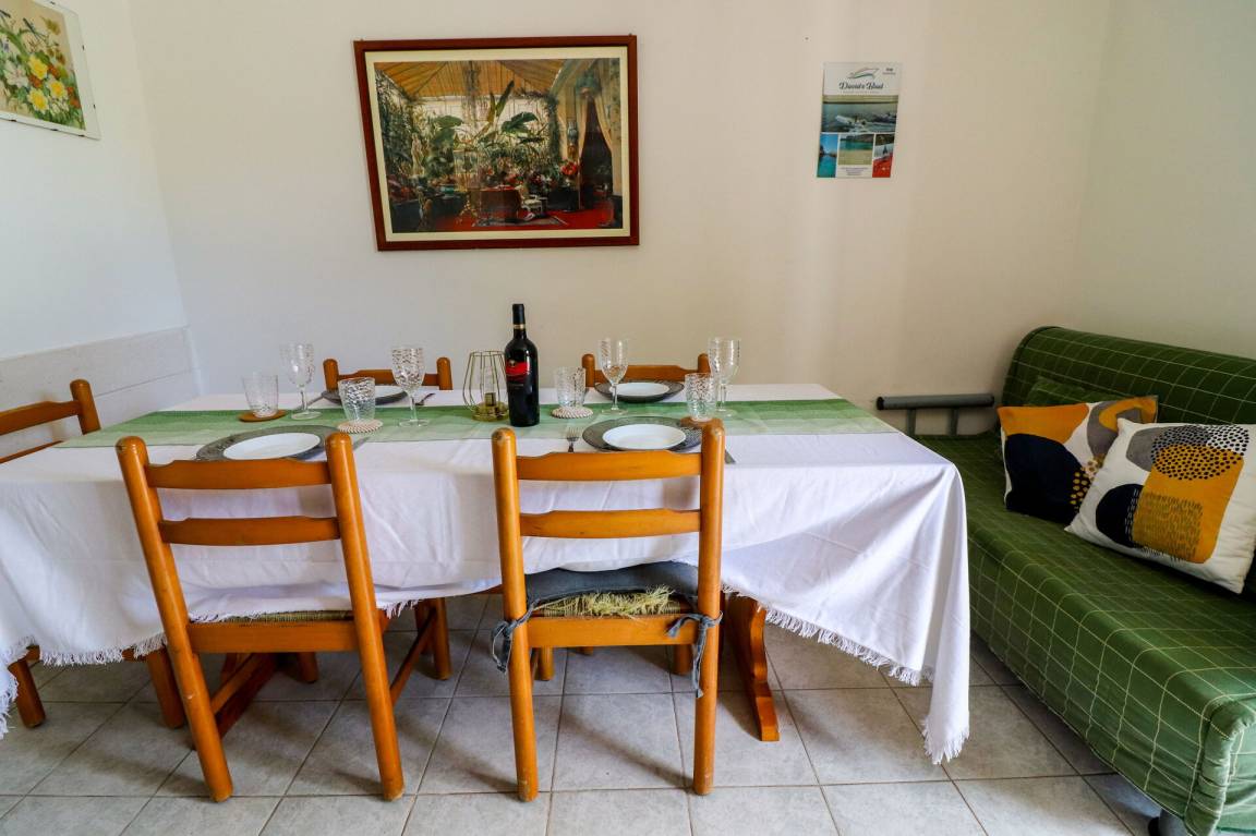 Wohnküche: gut ausgestattete Küche, Esstisch (Personen: 6), Kühlschrank, Tiefkühler, Herd, Ofen, Doppel-Schlafsofa, WiFi Internet, Klimaanlage, TV, Ausgang auf den Garten.