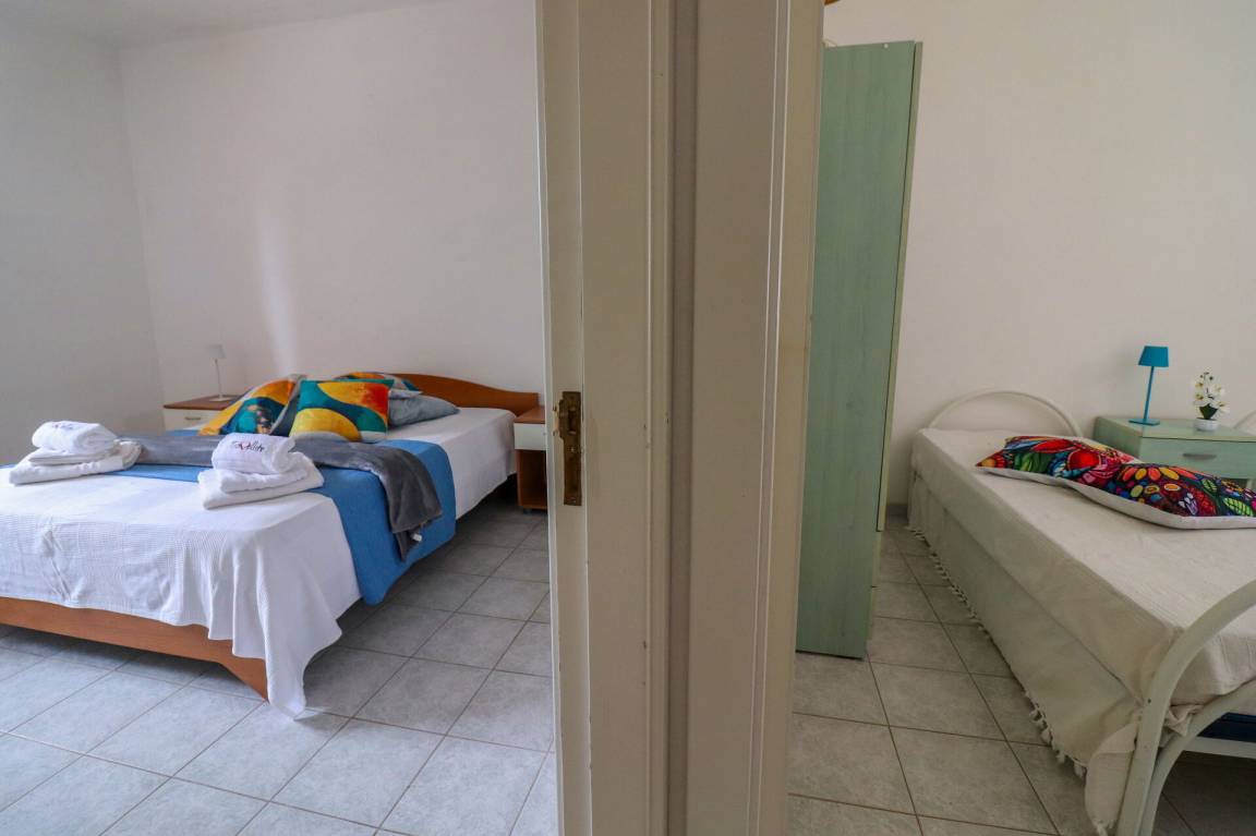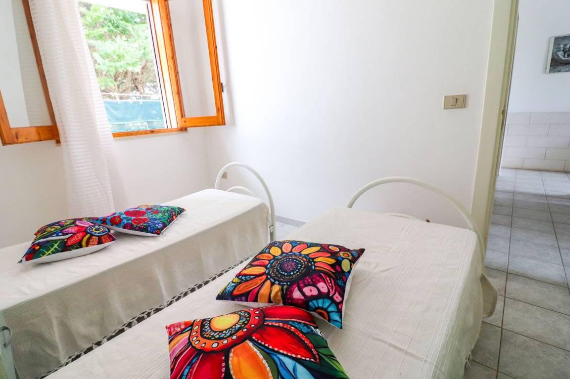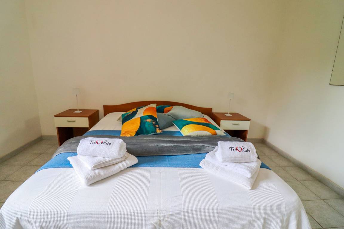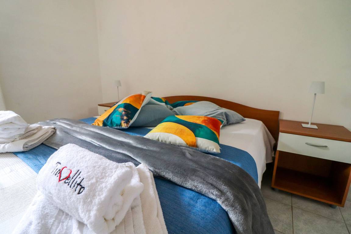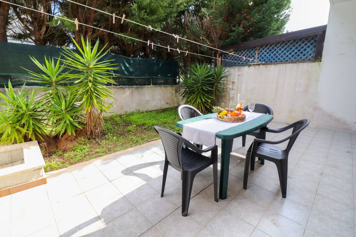 Wohnküche: gut ausgestattete Küche, Esstisch (Personen: 6), Kühlschrank, Tiefkühler, Herd, Ofen, Doppel-Schlafsofa, WiFi Internet, Klimaanlage, TV, Ausgang auf den Garten.