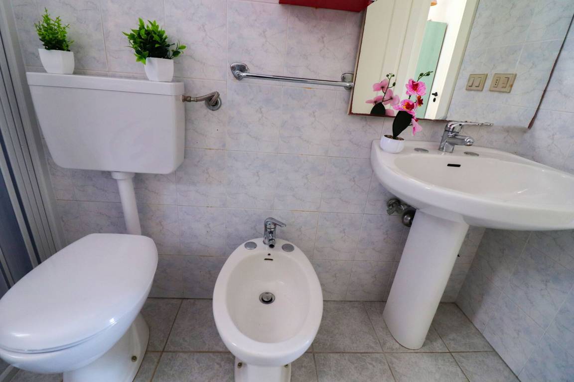 Badezimmer: Waschbecken, WC, Bidet, Dusche, Fön, Waschmaschine.