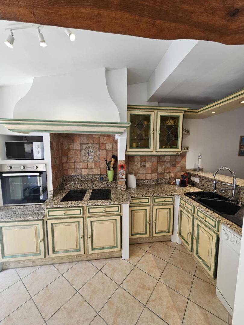 Wohnzimmer mit voll ausgestatteter Küche, Essbereich und Sitzecke (Doppelschlafsofa) mit Zugang zu einer großen, 90 m² großen Terrasse mit einem unbeheizten, ganzjährig nutzbaren Pool (6 x 3 x 1,80 m), Gartenmöbeln und einem Gasgrill.