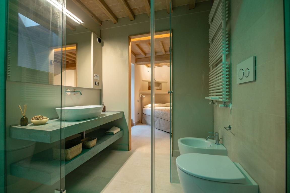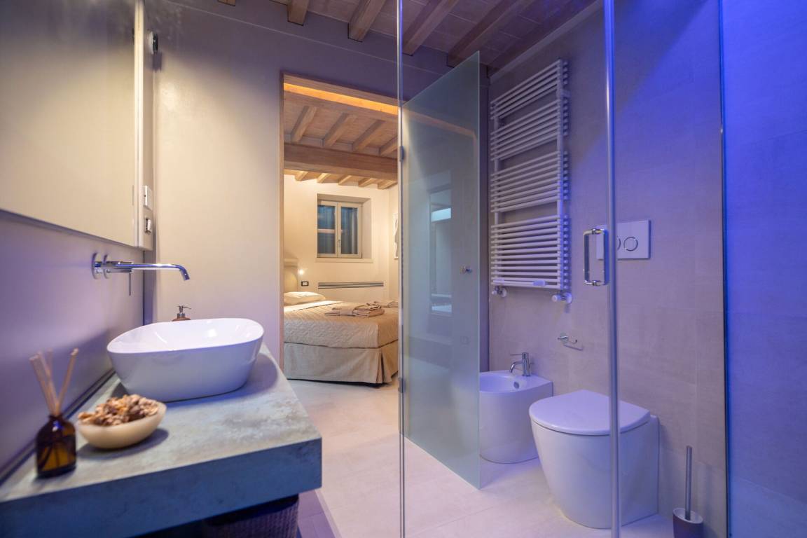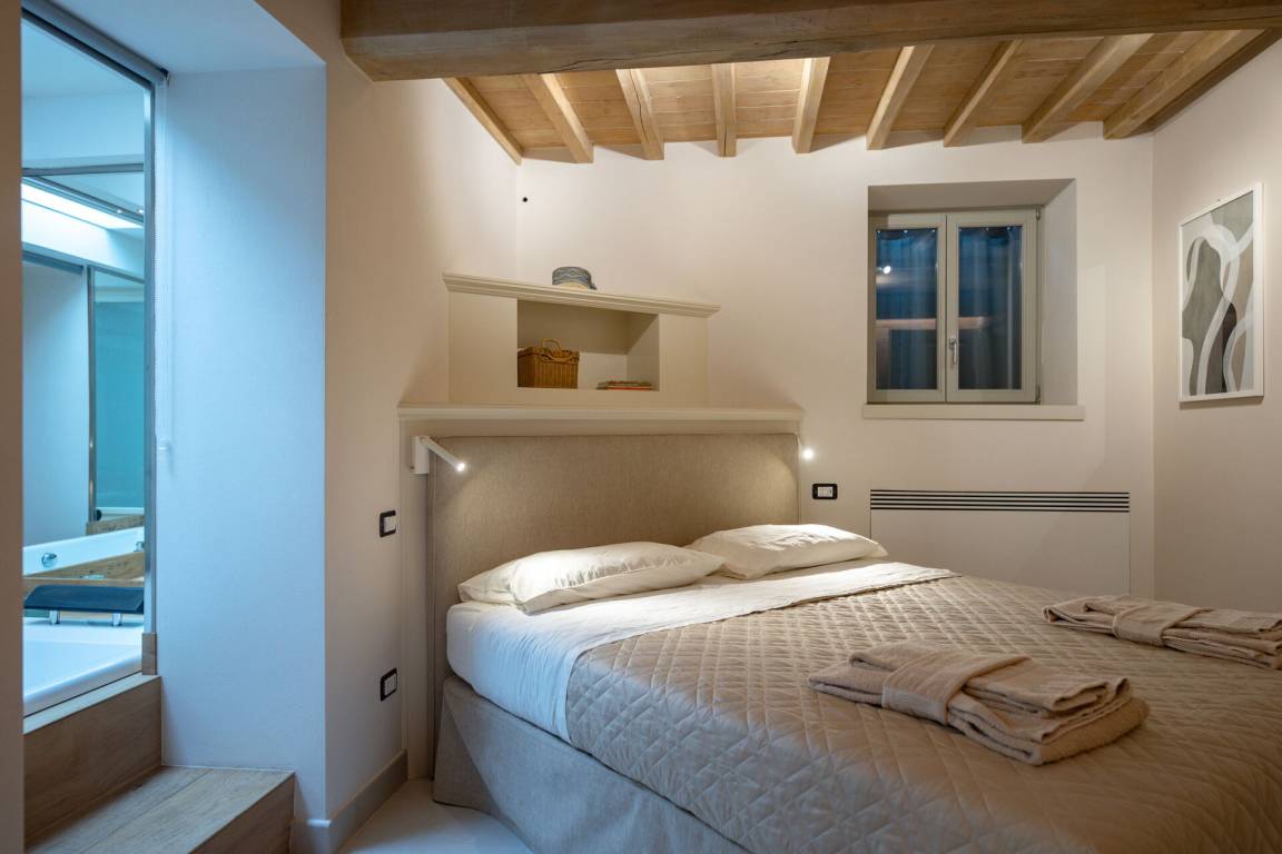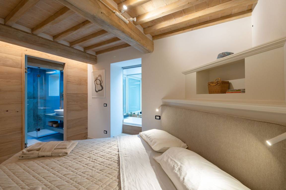 Schlafzimmer mit Bad: Doppelbett, WiFi Internet, Klimaanlage, Fliegengitter, Whirlpool-Badewanne, Waschbecken, WC, Bidet, Dusche, Fön.