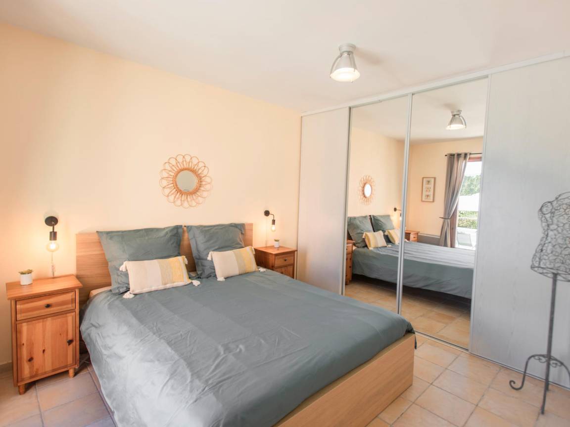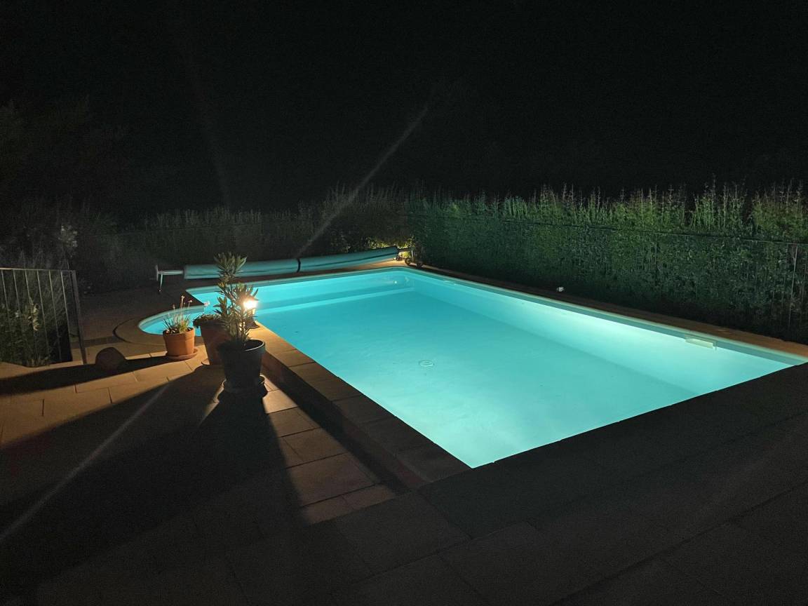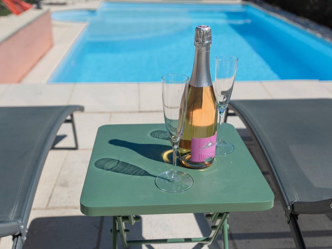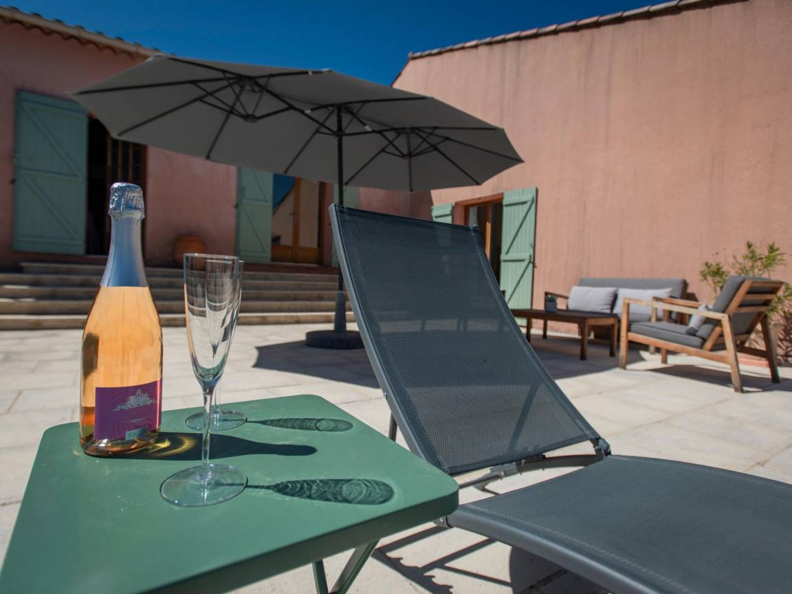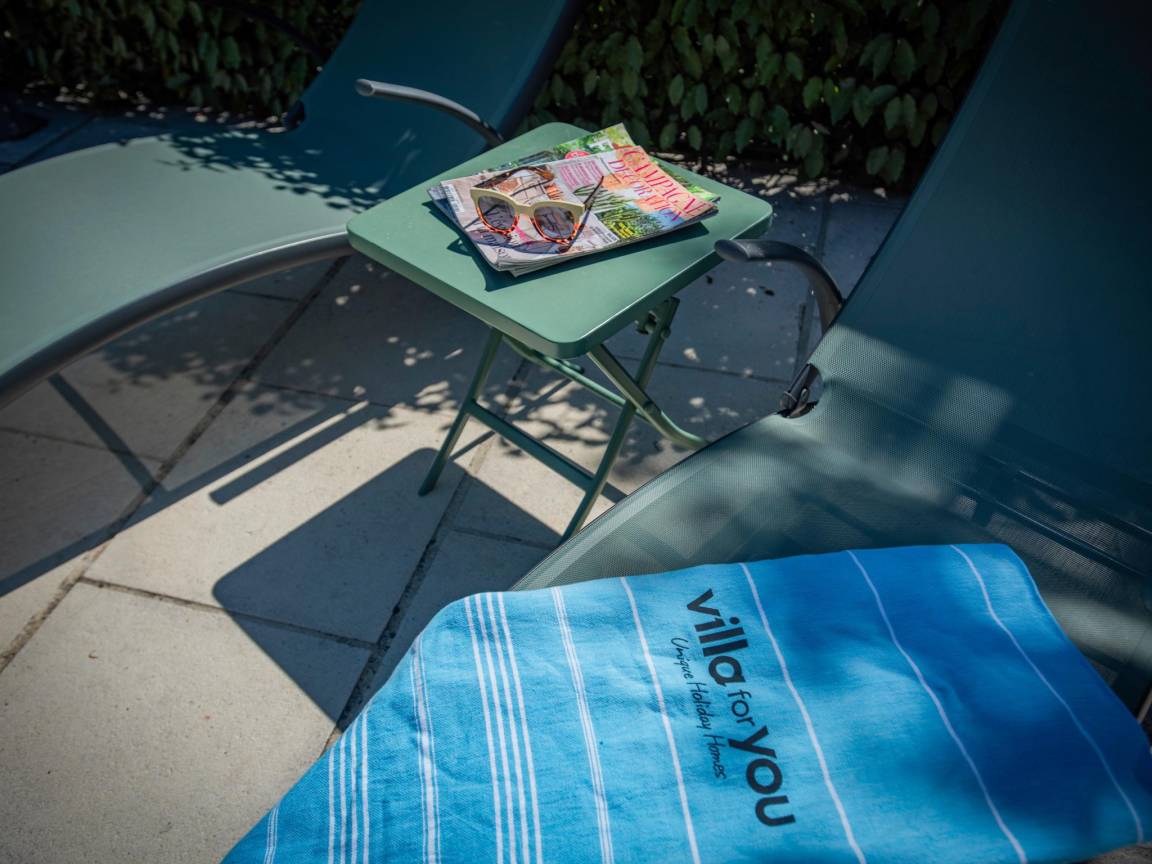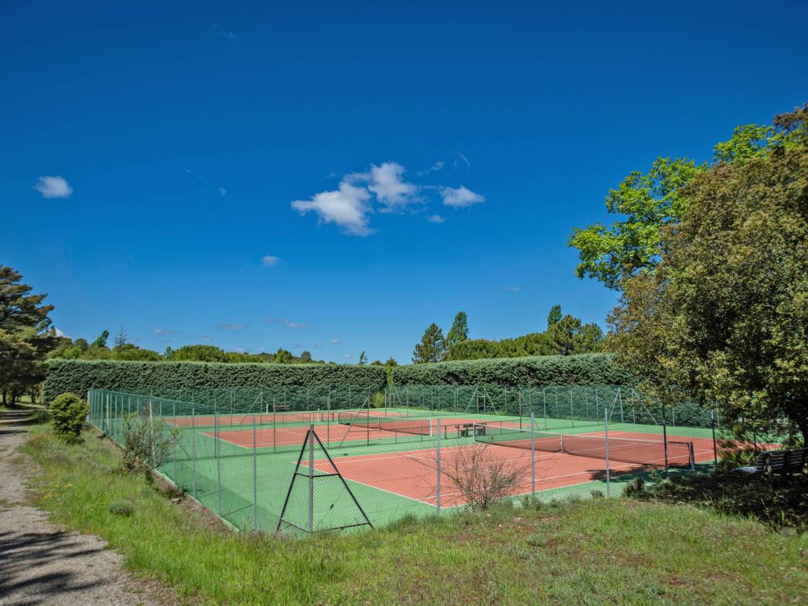 Terrasse(alleinige Nutzung, überdacht), 2x Terrasse(alleinige Nutzung), Garten(alleinige Nutzung, angelegt, illuminiert, umzäunt, 1,5 hm2), Gartenmöbel, BBQ(Gas), 2x Parkplatz, Liegestühle, 2x Parasol, Pool(alleinige Nutzung, im Garten, Wasseralarm, umzäunt, 10 x 5 m., Tiefe: 0.8 - 2.0m, geöffnet von Mai bis einschließlich Sep), 3x Tennisplatz(Gemeinschaftliche Nutzung mit anderen Gästen), Boulebahn(Gemeinschaftliche Nutzung mit anderen Gästen), 1x Kinderbett (ohne Bettwäsche), 1x Hochstuhl, Gartenlounge, Ventilator