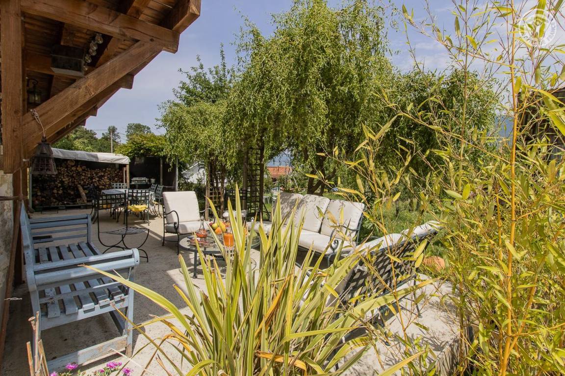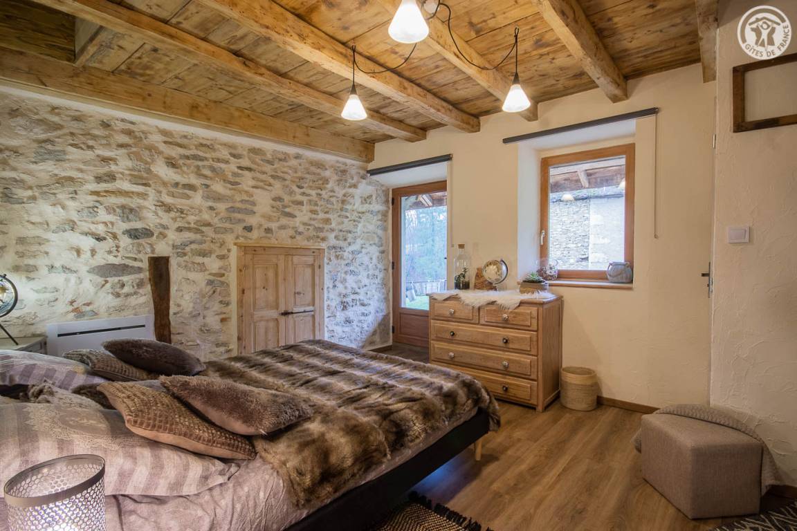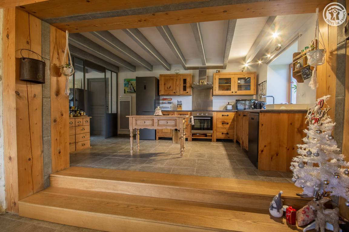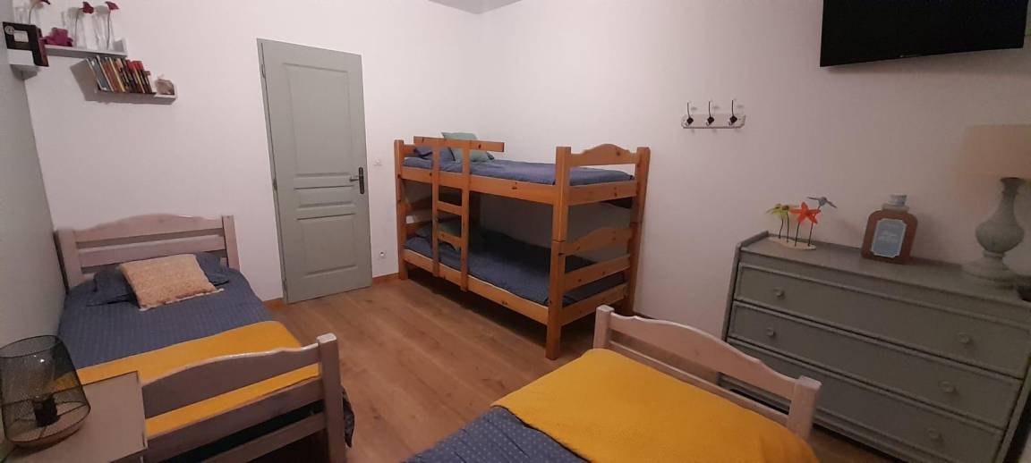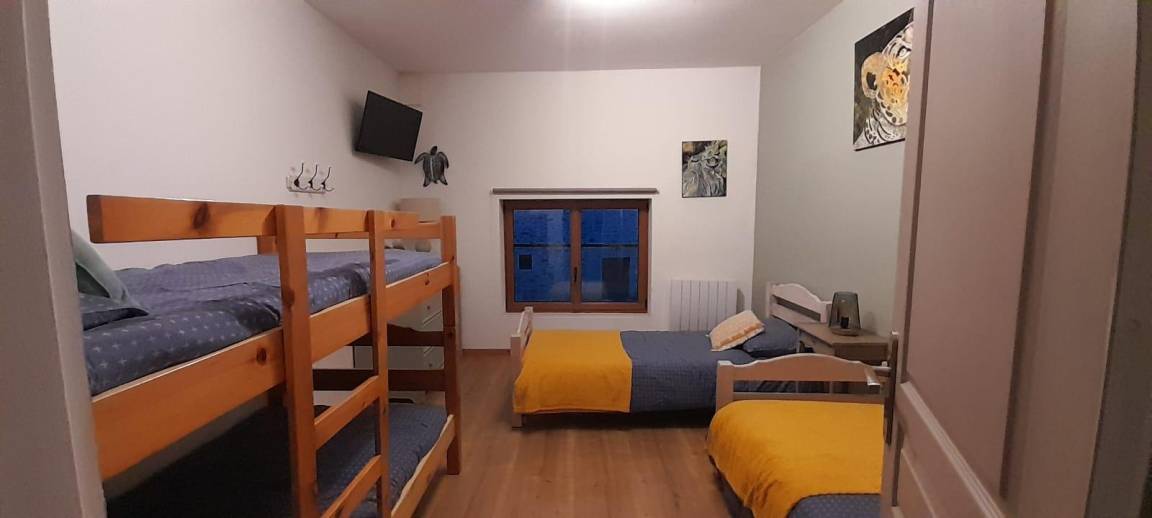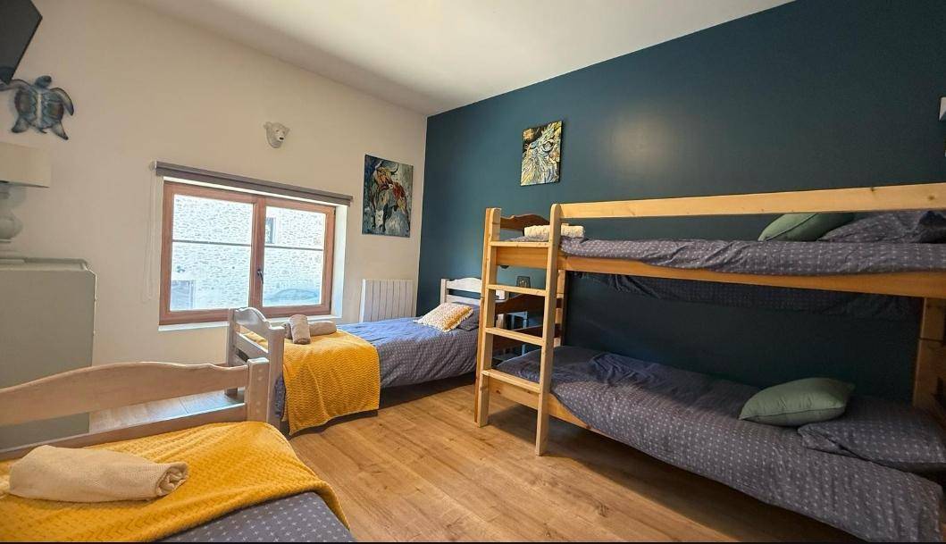 Einfamilienhaus auf 2 Ebenen. Erdgeschoss: ein durch ein Glasdach getrennter Eingang, Küche-Wohnzimmer-Wohnzimmer mit Holzofen (Holz inklusive), WLAN-Verbindung. Obergeschoss: große Mezzanine / Entspannungsbereich (Schlafsofa 120 x 190 cm für 1 Person), 4 Schlafzimmer mit je TV (1 Doppelbett 140 x 190 cm / 1 Doppelbett 160 x 200 cm mit Balkon-Terrasse / 2 Einzelbetten 80 x 80 cm). 190 cm / 1 Schlafzimmer mit Badeinsel und eigenem WC, 1 Doppelbett 160 x 200 cm). Badezimmer mit Eckbadewanne + ebenerdiger Dusche, separates WC. Wohnzimmer, das auf eine sonnige Terrasse mit Gartenmöbeln führt. Angenehmer Obstgarten von 2000 m² auf dem Grundstück. Private Parkplätze vor Ort.