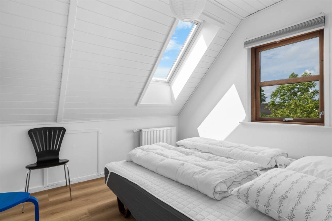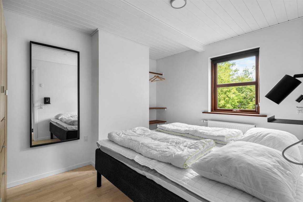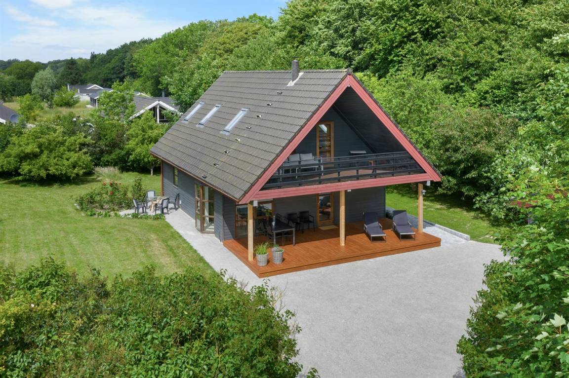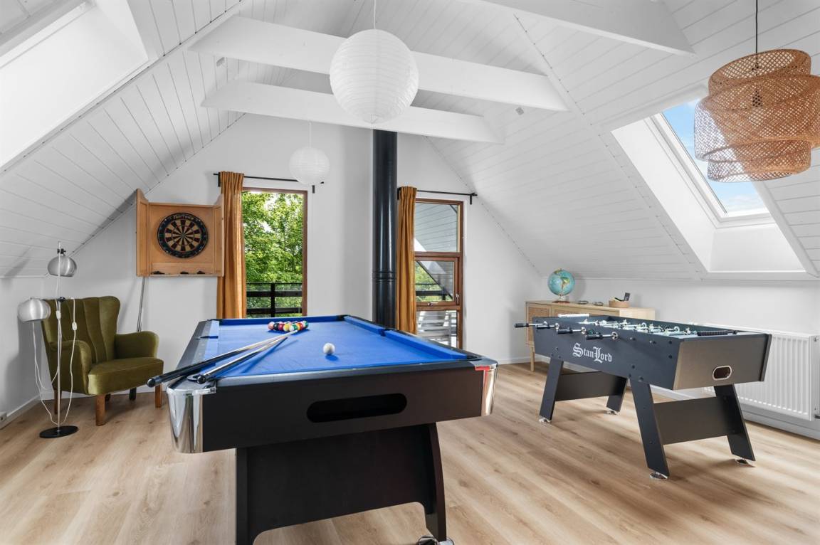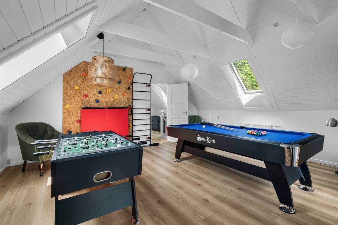 Herrlich großes und hübsches Ferienhaus mit Platz für die ganze Familie – sowohl drinnen als auch draußen! Zwei gut eingerichtete Etagen. Im 1. Stock Aktivitätsraum mit mehreren Aktivitäten, u. a. einer Kletterwand. Vom Aktivitätsraum gelangt man auf den herrlichen Balkon mit Loungebereich im Freien.