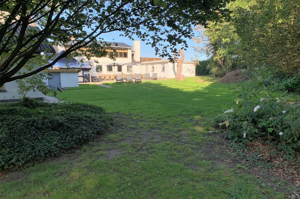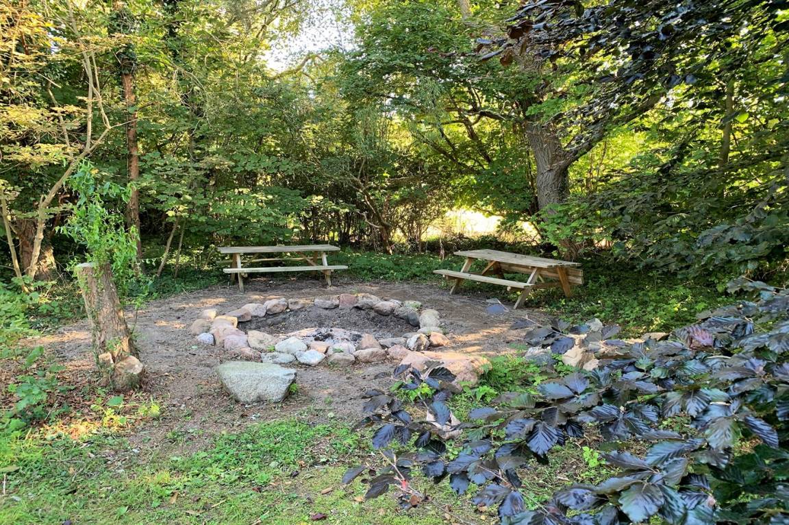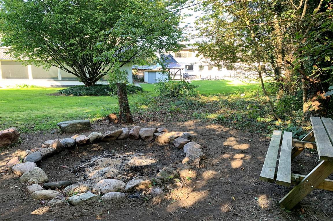 Hinter dem Haus gibt es eine große Terrassenfläche und von dort aus gelangt man in den großen Garten, der unter anderem viele alte schöne Bäume, einen großen Lagerfeuerplatz, einen Spielturm mit Rutsche, Schaukeln, einen Sandkasten und viel Platz für Aktivitäten im Freien bietet.