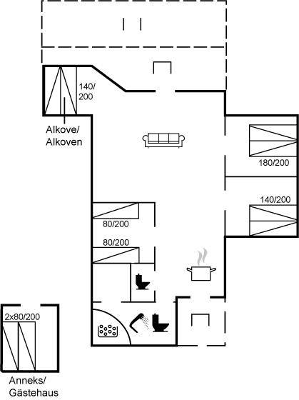 SchlafverhältnisseDie Schlafplätze verteilen sich auf 4 Schlafräume. 4 Schlafplätze in Doppelbetten. 4 Schlafplätze in Einzelbetten.2 Schlafplätze im Alkoven. 2 von diesen Schlafplätzen befinden sich im Gästehaus und 2 befinden sich im Wohnzimmer. Ferner steht ein Kinderbett zur Verfügung.
