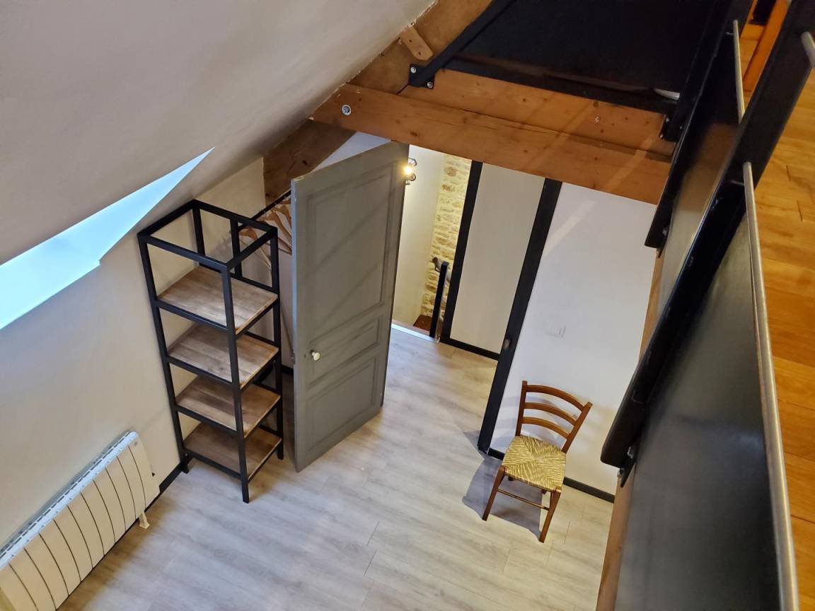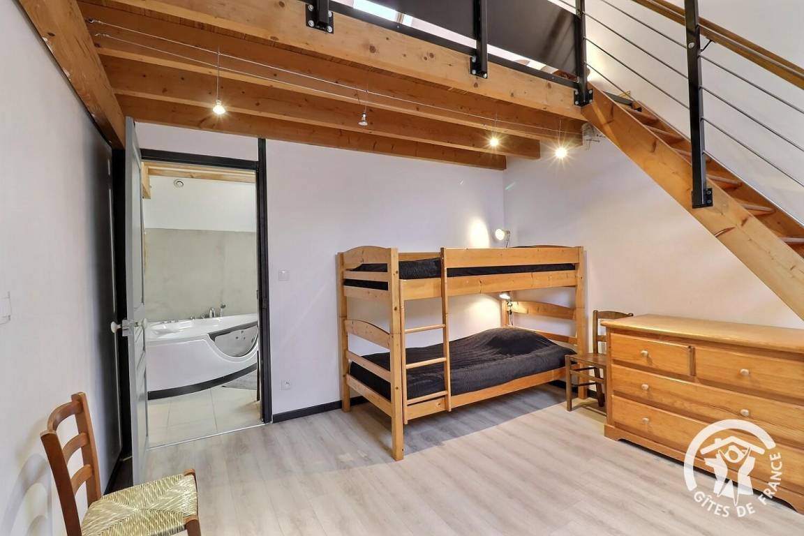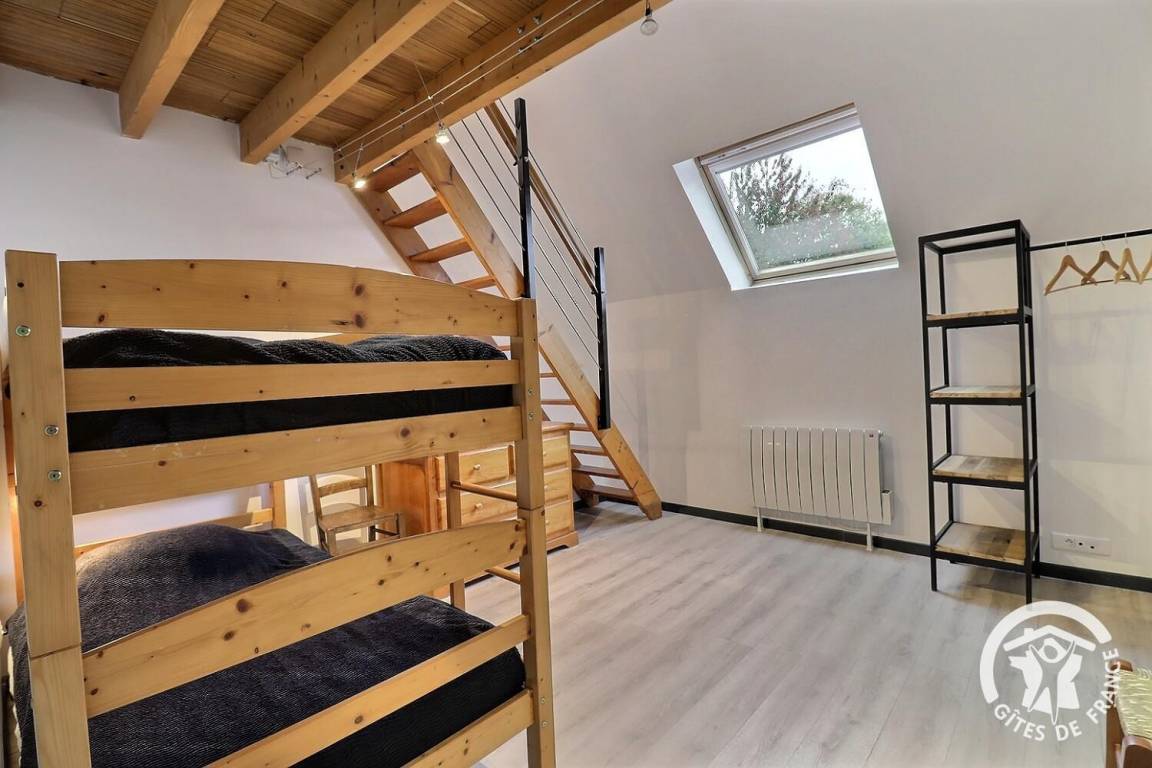 - ein Schlafzimmer mit zwei 90 x 190 cm großen Etagenbetten im Zwischengeschoss (über eine Treppe erreichbar), einem 160 x 200 cm großen Bett und einem 90 x 190 cm großen Bett.