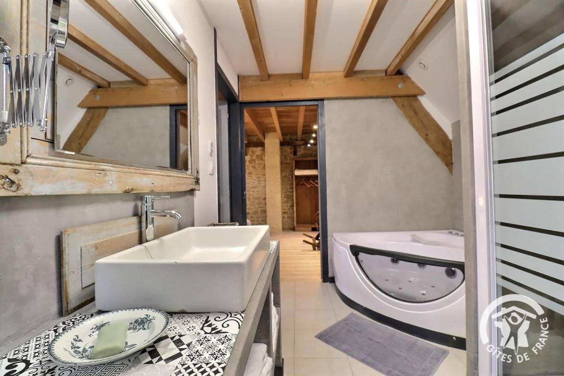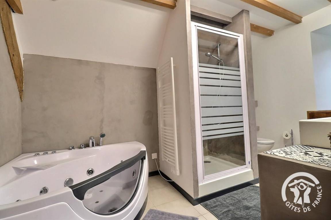 - ein Badezimmer, das die beiden Schlafzimmer verbindet, mit Whirlpool-Badewanne, Dusche und WC.