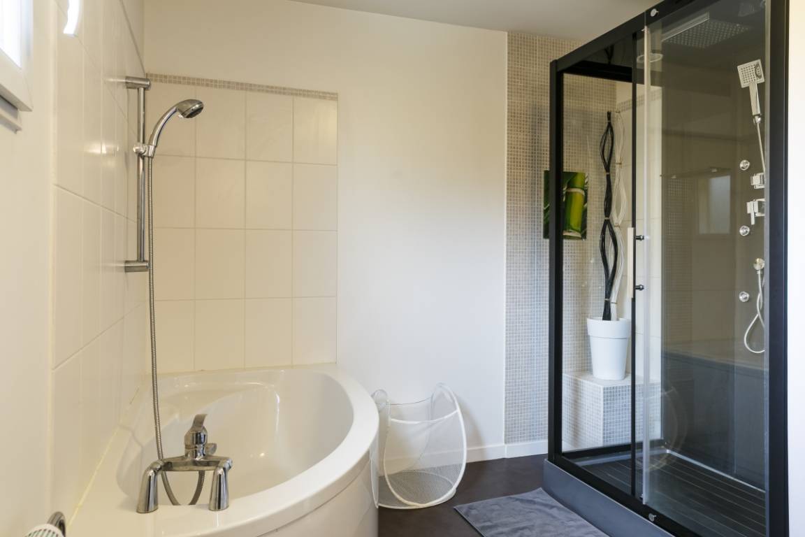 - ein Badezimmer mit Dusche, Badewanne und WC.