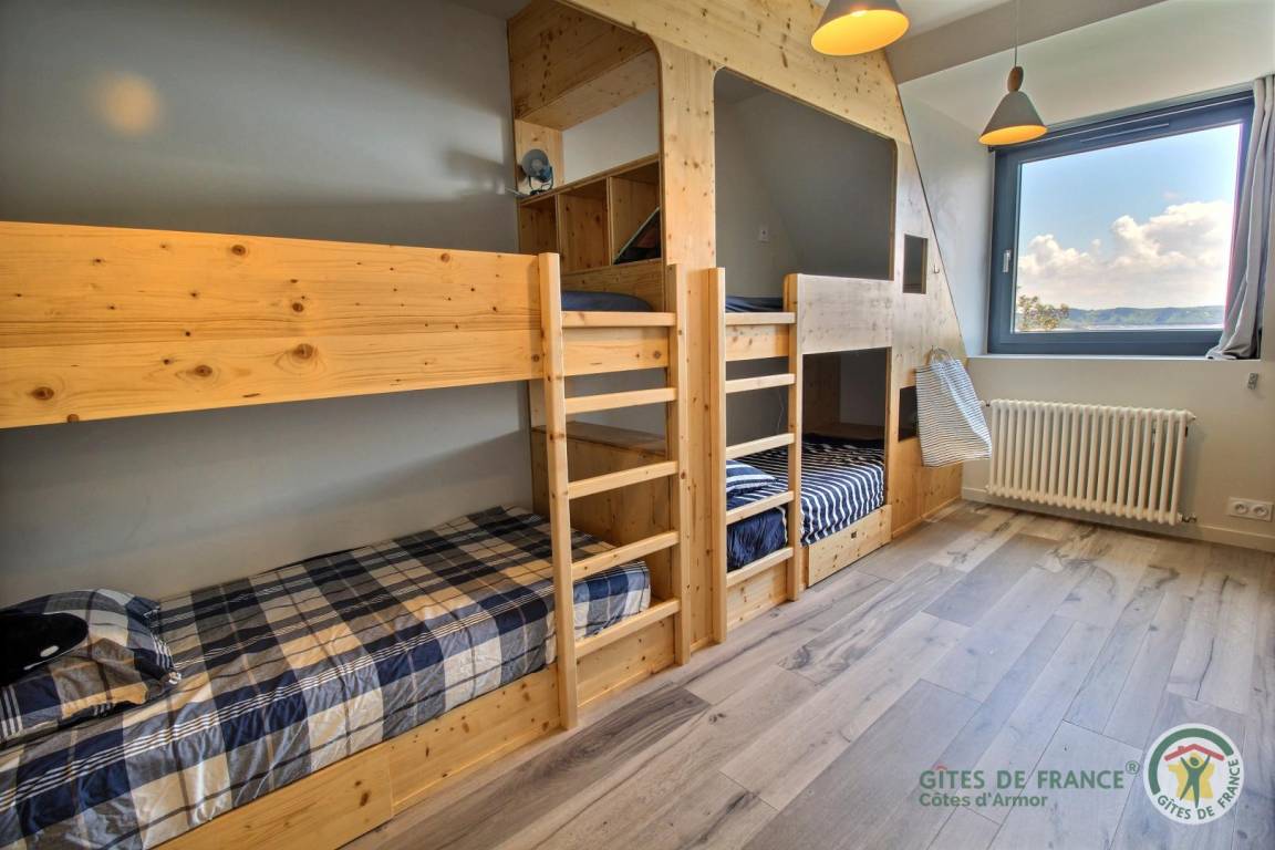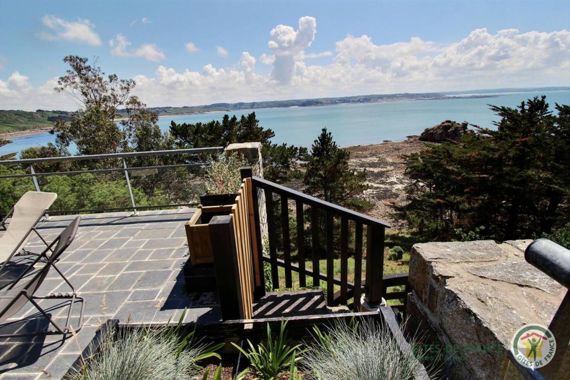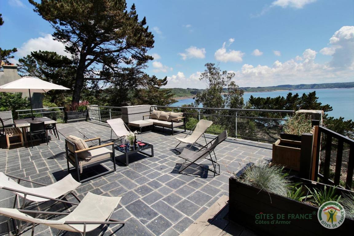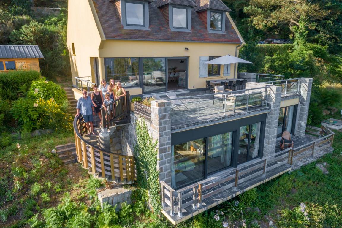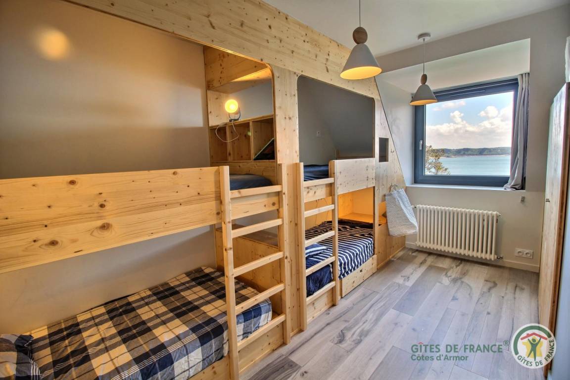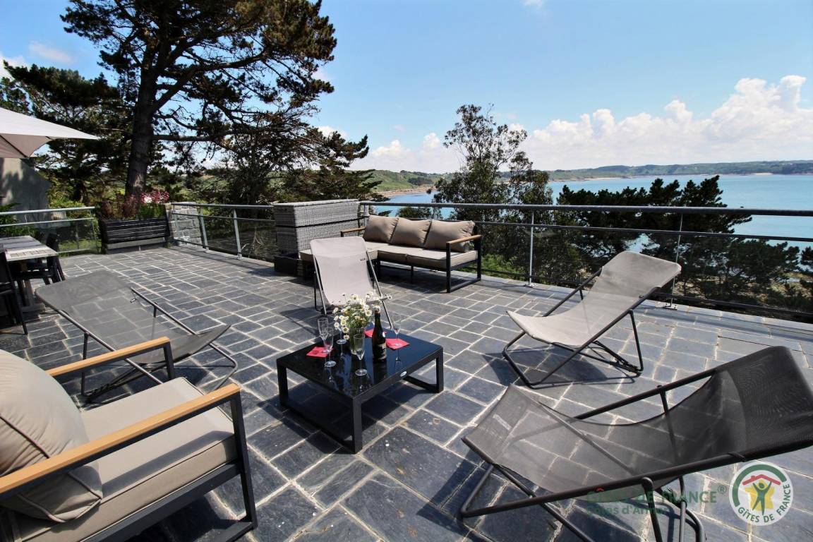 Your holiday rental includes, on the ground floor: an entrance hall with a closet, a large living room with a fireplace and a fully equipped kitchen opening directly onto a furnished terrace with panoramic sea views. A few steps down lead to the garden level, which comprises a lounge equipped with a home cinema system (projector), three bedrooms, each with its own private bathroom: a west-facing bedroom with two single beds (80x200) that can be joined to make a double bed (160x200) and an en-suite shower room; an east-facing bedroom with two single beds (80x200cm) that can be joined together and an en-suite shower room; and a large south-facing bedroom overlooking the sea with a double bed (160x200) and an en-suite shower room (shower and toilet). There is also a laundry area and a separate toilet. Upstairs: 1 bedroom (1 double bed 160x200) and 1 dormitory bedroom (3 single beds 90x200), bathroom (bathtub) and separate toilet. 70 m² terrace, 6000 m² property.