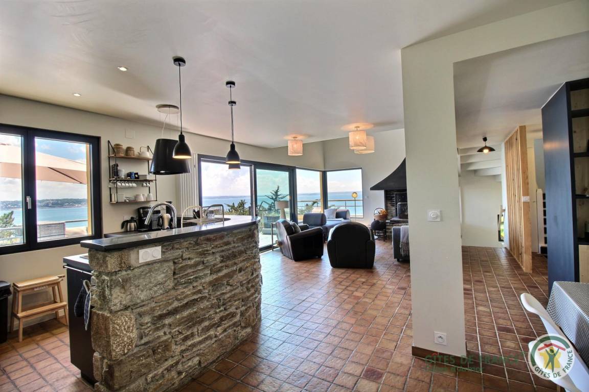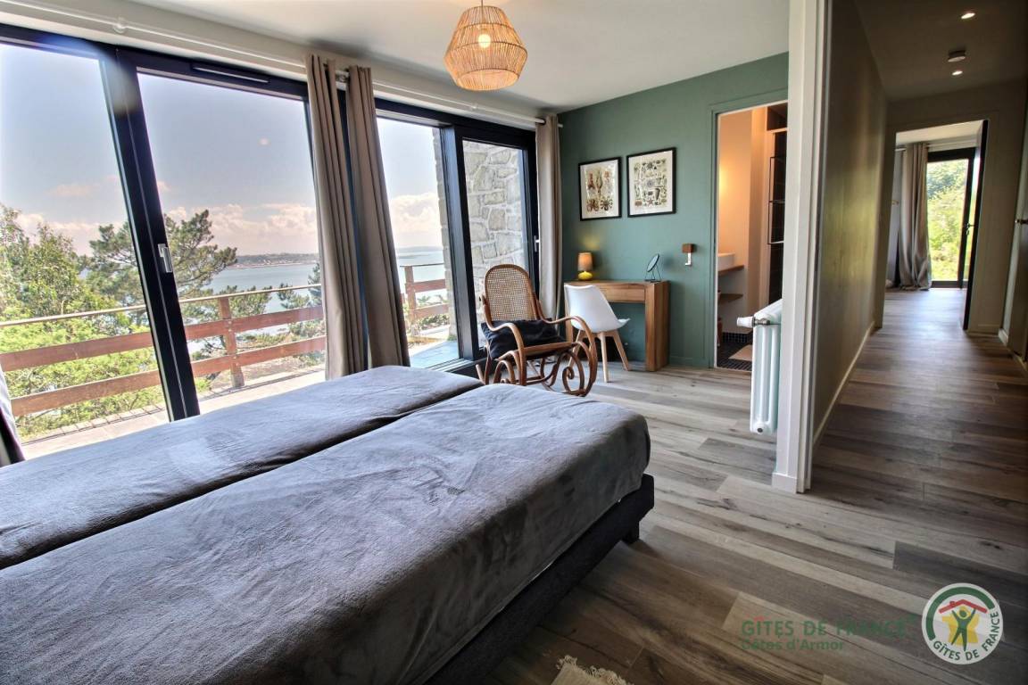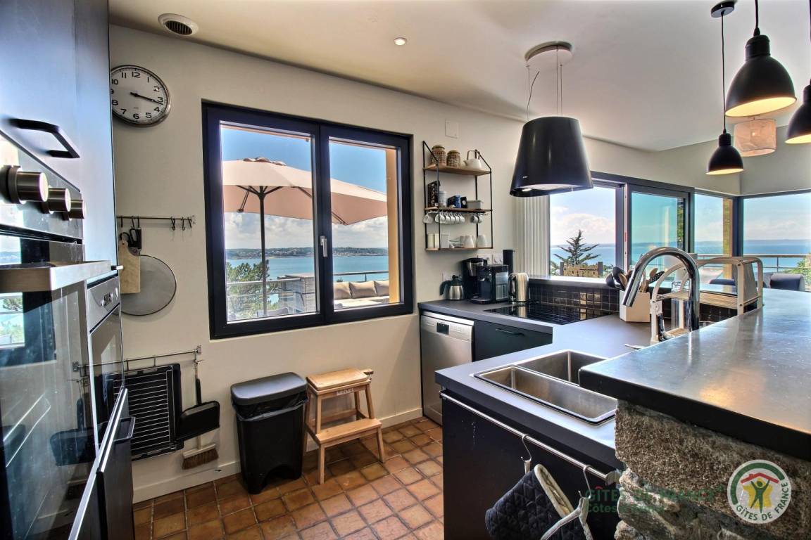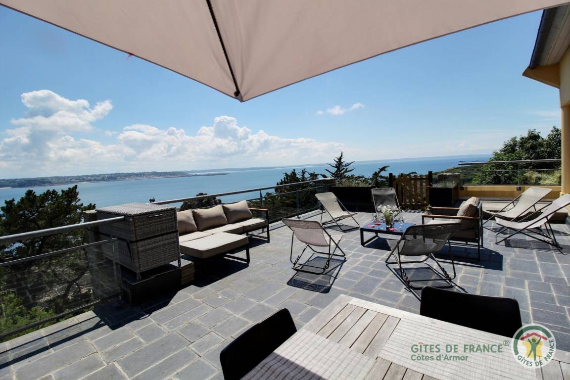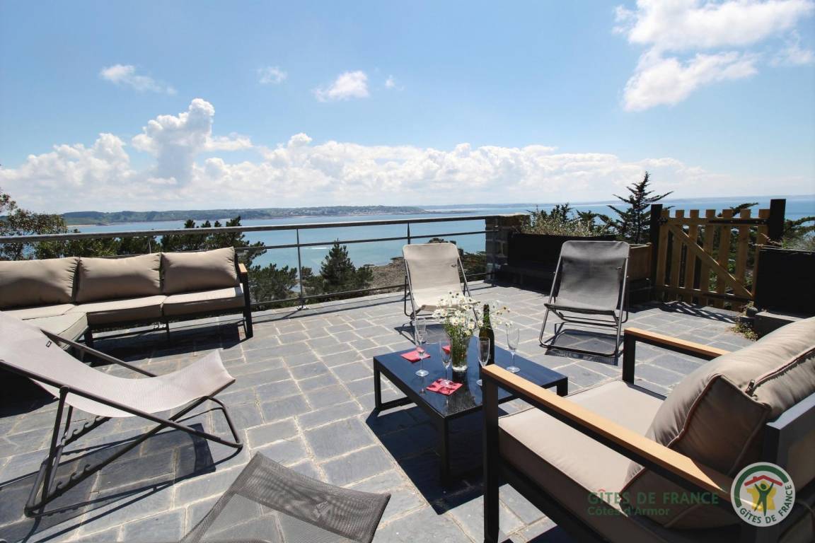 Your holiday rental includes, on the ground floor: an entrance hall with a closet, a large living room with a fireplace and a fully equipped kitchen opening directly onto a furnished terrace with panoramic sea views. A few steps down lead to the garden level, which comprises a lounge equipped with a home cinema system (projector), three bedrooms, each with its own private bathroom: a west-facing bedroom with two single beds (80x200) that can be joined to make a double bed (160x200) and an en-suite shower room; an east-facing bedroom with two single beds (80x200cm) that can be joined together and an en-suite shower room; and a large south-facing bedroom overlooking the sea with a double bed (160x200) and an en-suite shower room (shower and toilet). There is also a laundry area and a separate toilet. Upstairs: 1 bedroom (1 double bed 160x200) and 1 dormitory bedroom (3 single beds 90x200), bathroom (bathtub) and separate toilet. 70 m² terrace, 6000 m² property.