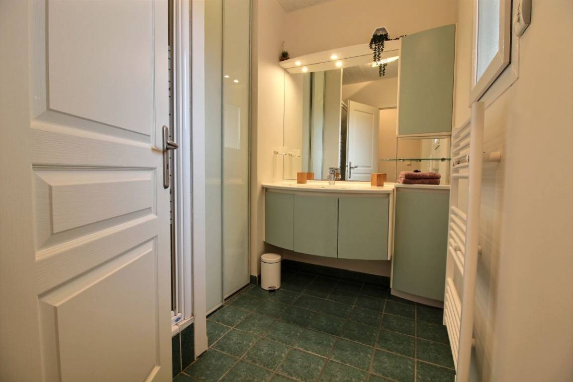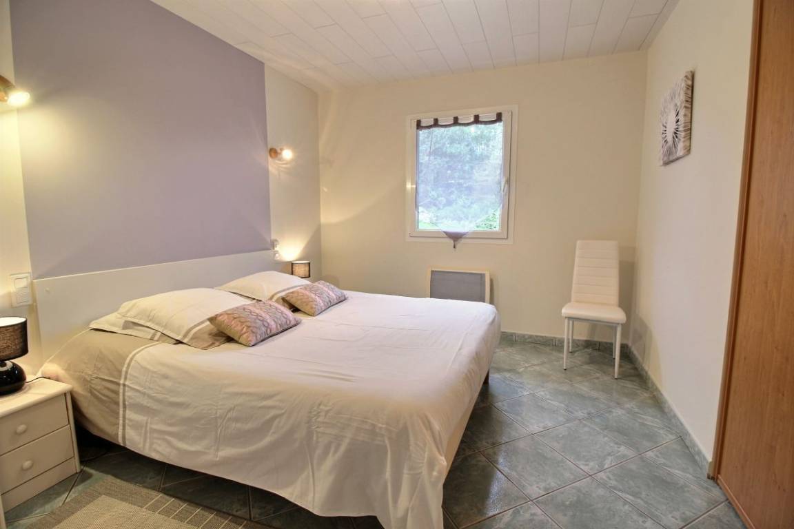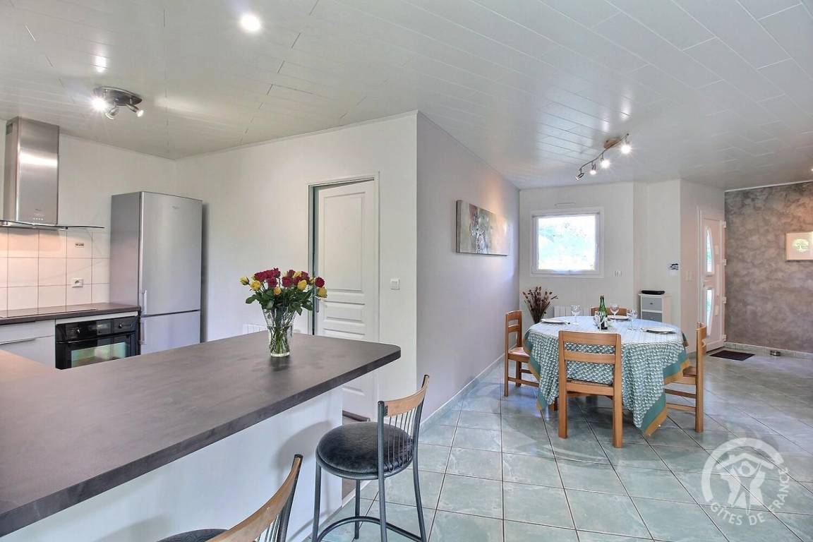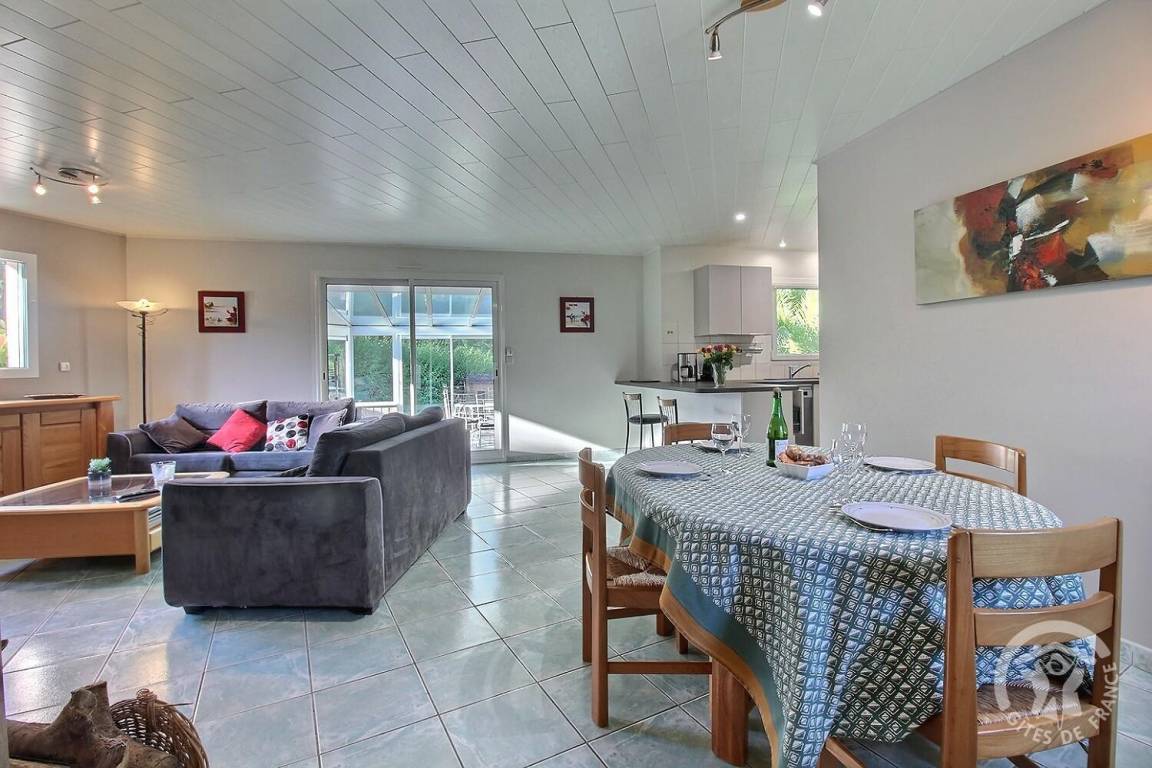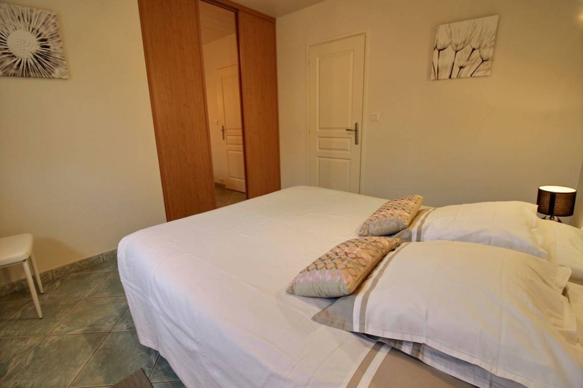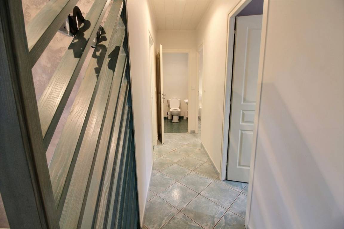 Einstöckige Ferienwohnung mit Einbauküche und Zugang zum Wohnzimmer. Veranda. 1 Schlafzimmer (1 160x200-Bett), 1 Schlafzimmer (2 90x200-Betten). Badezimmer mit Dusche und separatem WC.