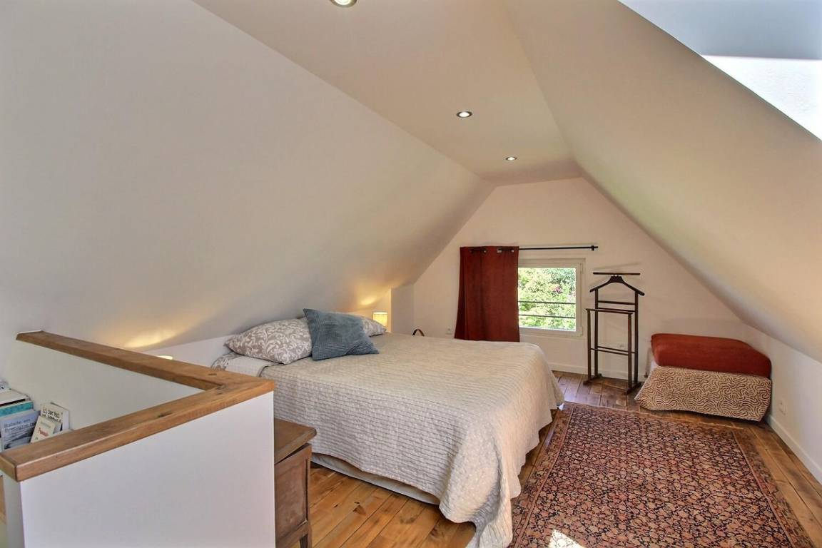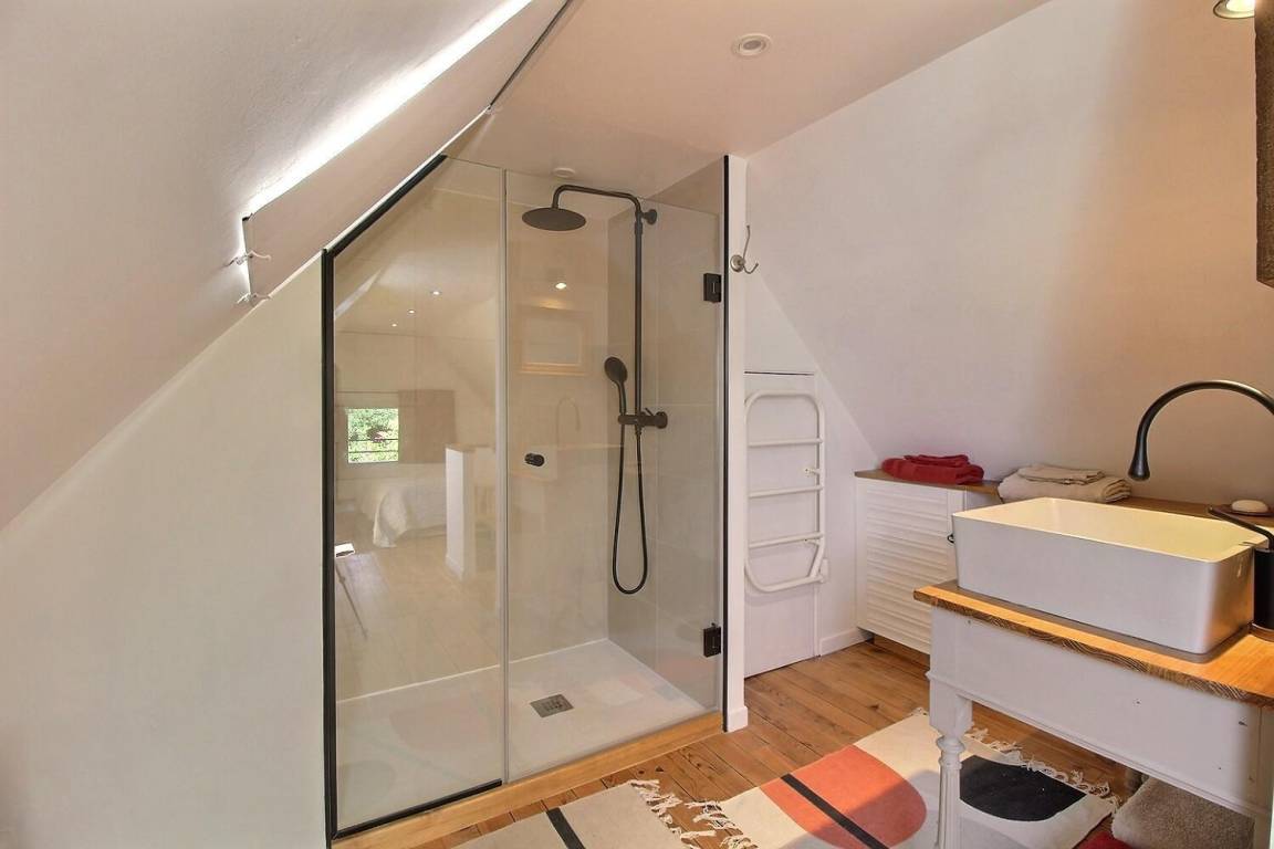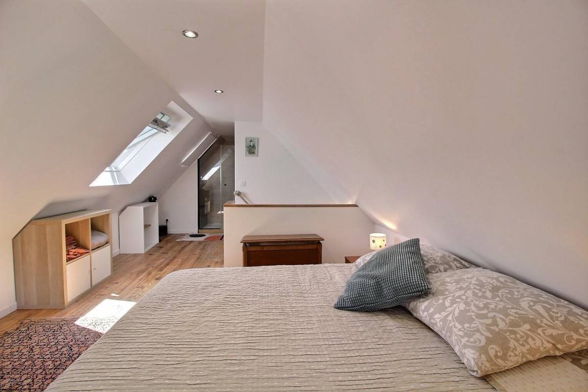 1 großes Schlafzimmer im Dachgeschoss (1 Doppelbett 140x190) mit eigenem Bad (Dusche).
