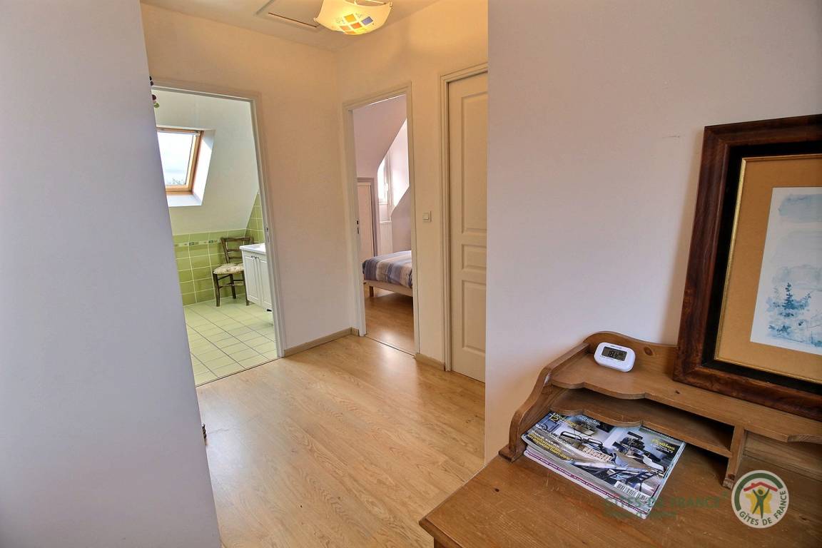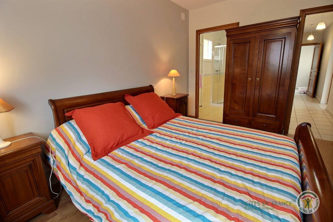 Ihre Ferienwohnung umfasst im Erdgeschoss: sehr angenehme Einbauküche, Wohnzimmer, 1 Schlafzimmer (1 Doppelbett) mit angrenzendem Badezimmer (Dusche + WC), WC und Garage. Obergeschoss: kleines Wohnzimmer im Zwischengeschoss, 2 Schlafzimmer (1 Bett 160x200) und (2 Einzelbetten), Badezimmer (Dusche) und WC. Terrasse und Landschaftsgarten von 1500 m².