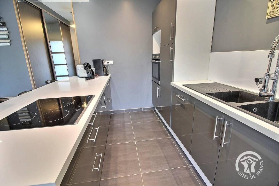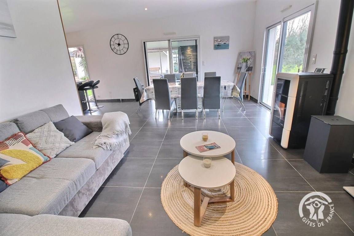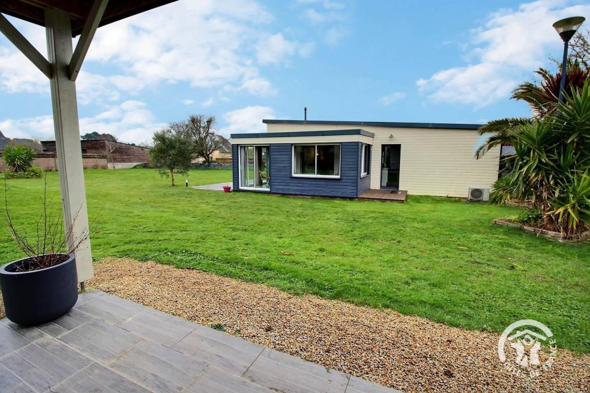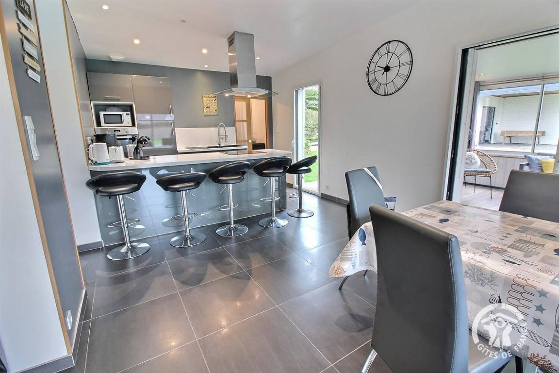 Dieses schöne, moderne Haus mit klaren Linien liegt in einer Sackgasse und empfängt Sie zu einem wundervollen Urlaub in Meeresnähe. Im Inneren gehen die offenen Räume fließend ineinander über: eine zum Wohnzimmer offene Küche und ein mit einem Pelletofen ausgestattetes Wohnzimmer.
