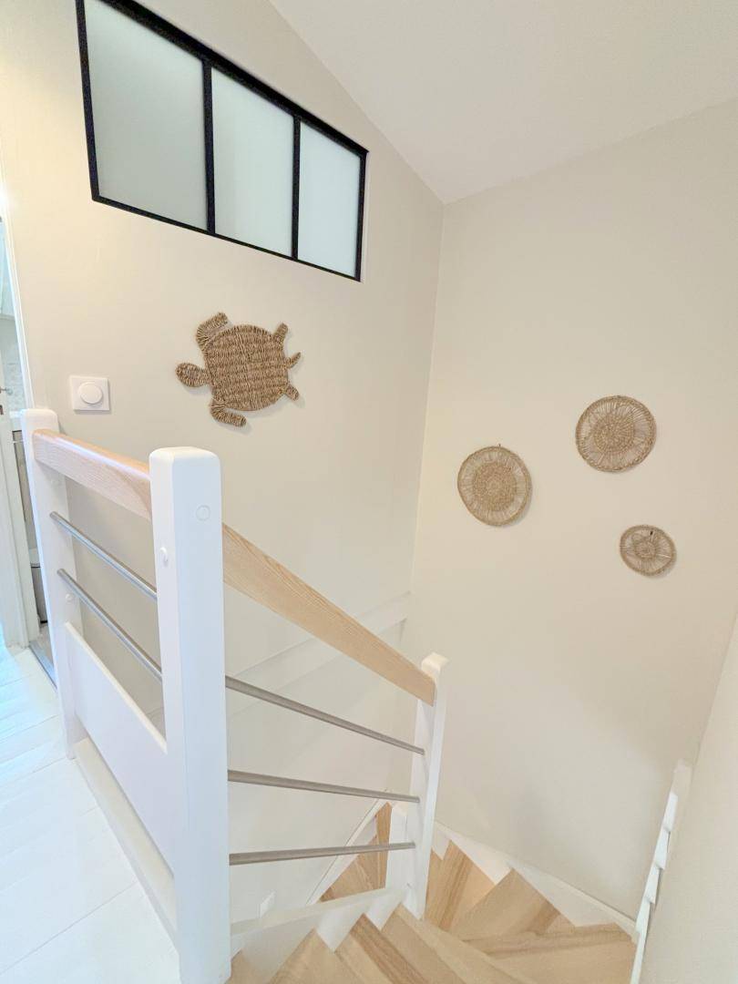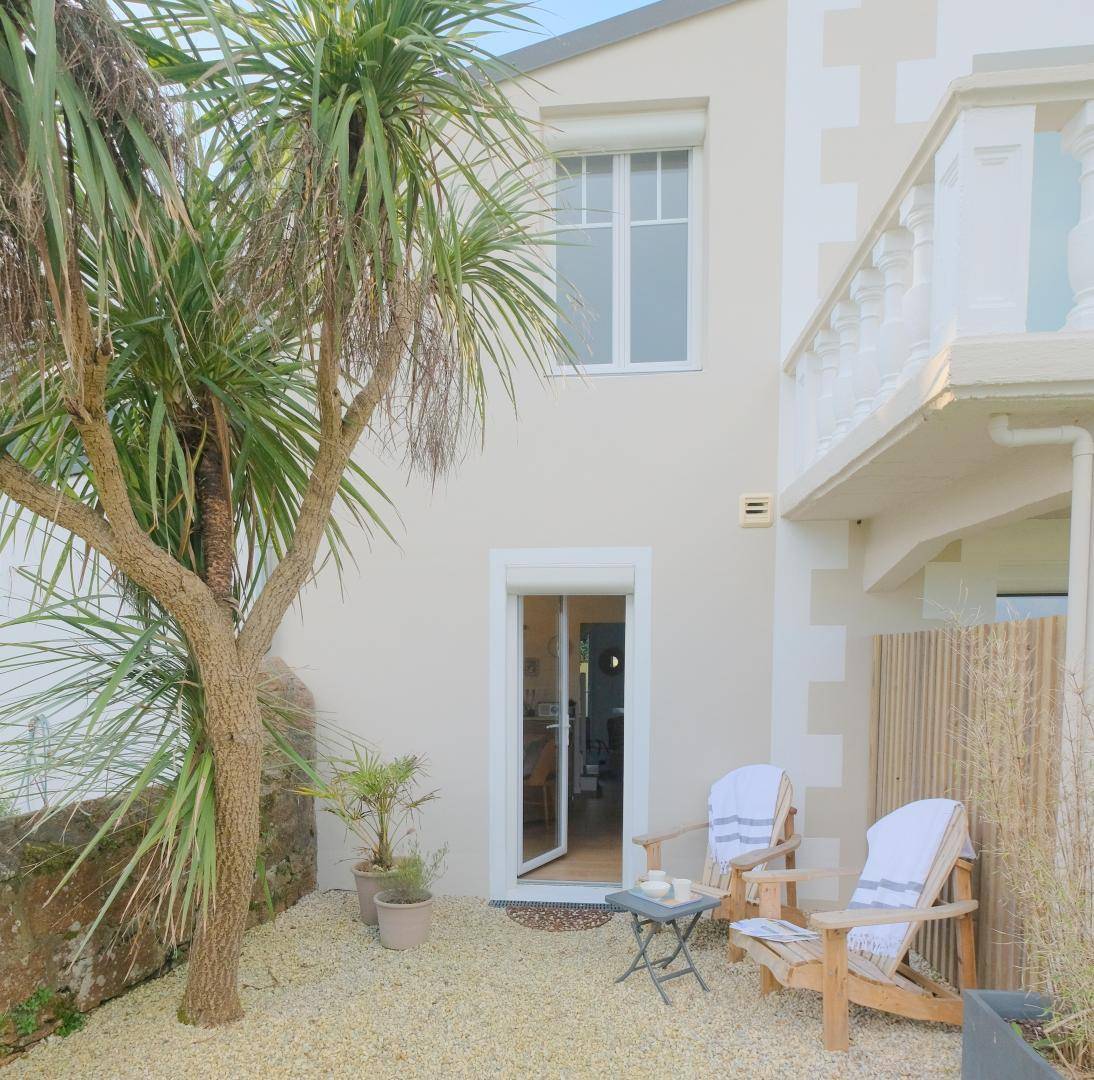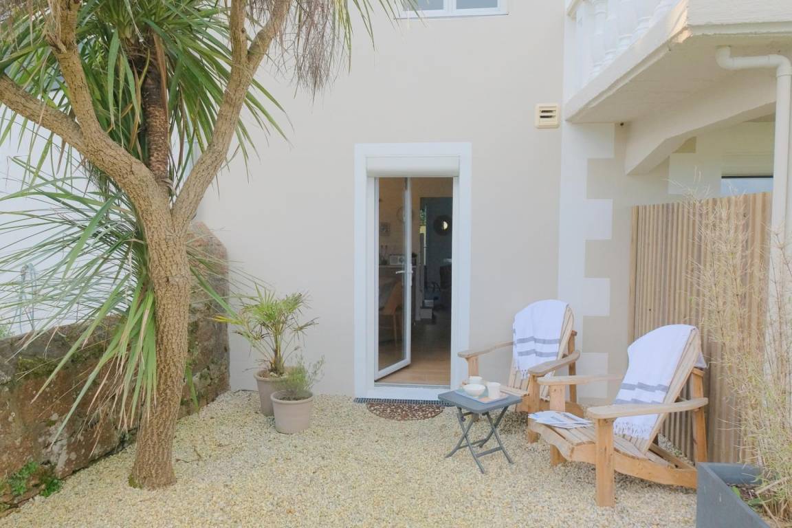 Ihre Ferienwohnung umfasst im Erdgeschoss eine gut ausgestattete Wohnküche mit Meerblick auf der einen und Blick auf den Innenhof auf der anderen Seite. Im Obergeschoss befinden sich ein Schlafzimmer (1 Bett 140x190) mit Meerblick, ein weiteres Schlafzimmer (1 Bett 80x200) und ein Duschbad mit WC. Garten mit Meerblick und Terrasse zur Hofseite. Privatparkplatz auf der Rückseite; Parken vor der Wohnung auf der Meerseite möglich. Geschmackvoll eingerichtete Wohnung in einem ehemaligen Hotel mit Meerblick auf Gartenebene, ideal für ein Paar mit Kind. Das Gebäude grenzt an andere Saisonvermietungen.