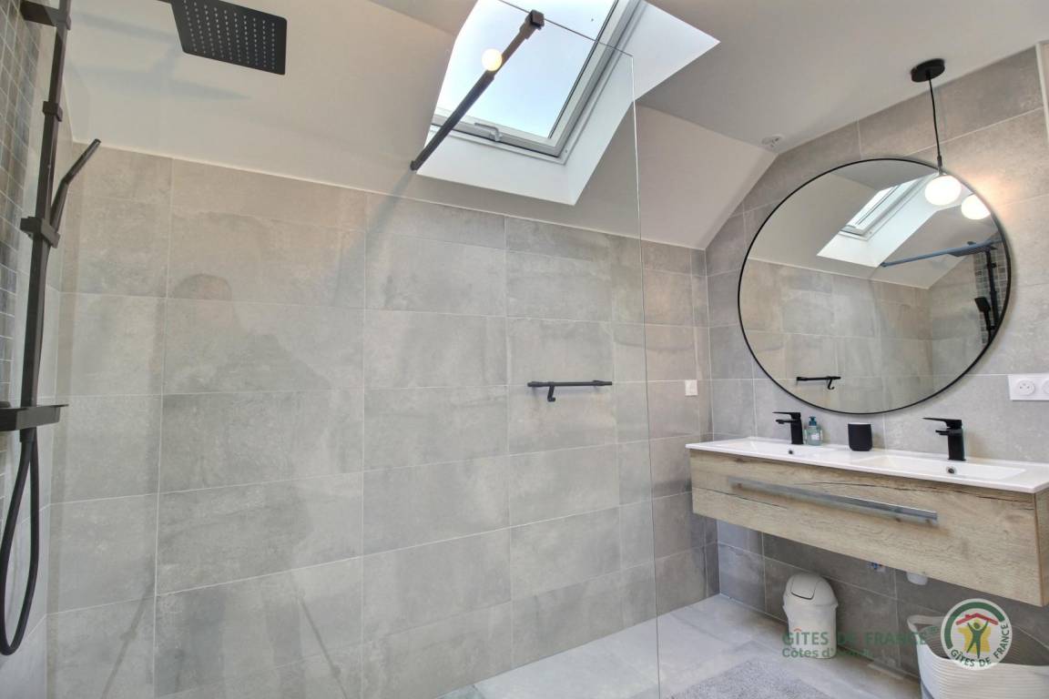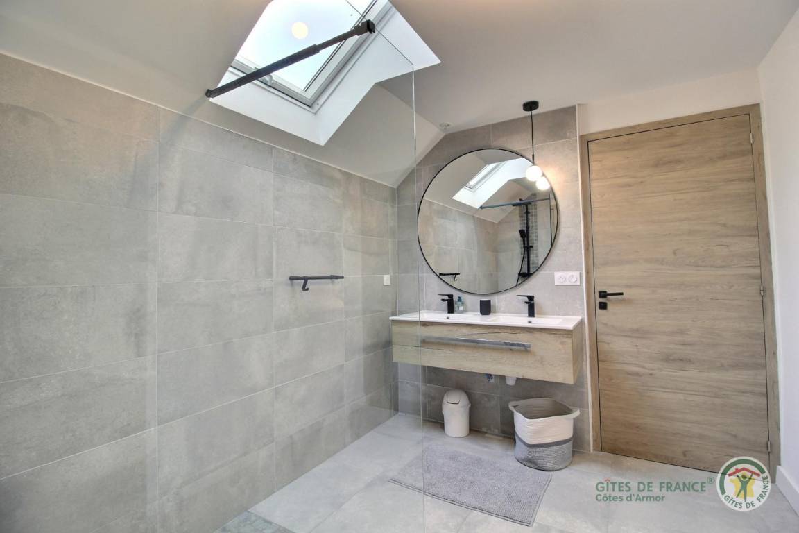 - Im Obergeschoss: ein erstes Schlafzimmer (1 160x200-Bett) mit eigenem Bad mit Badewanne, ein zweites Schlafzimmer (1 160x200-Bett) mit eigenem Bad mit Dusche, ein drittes Schlafzimmer (2 90x200-Betten).
