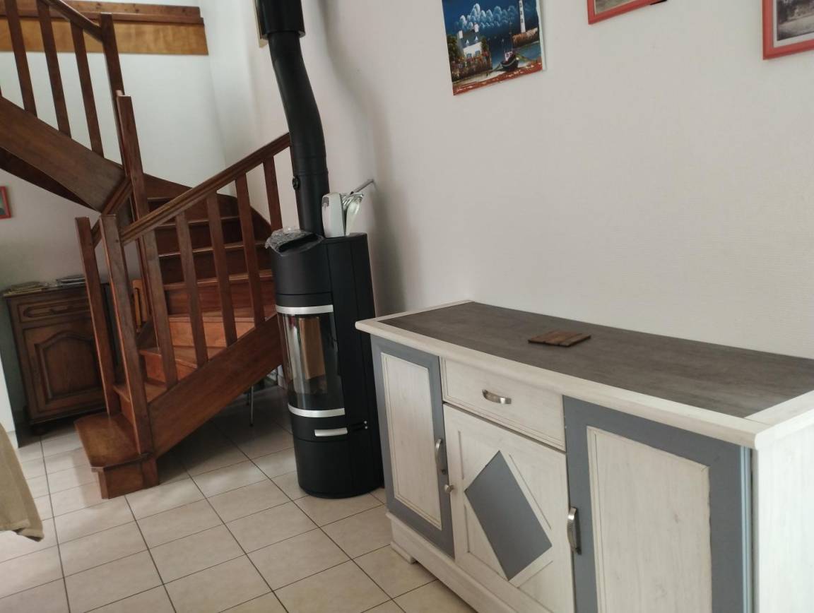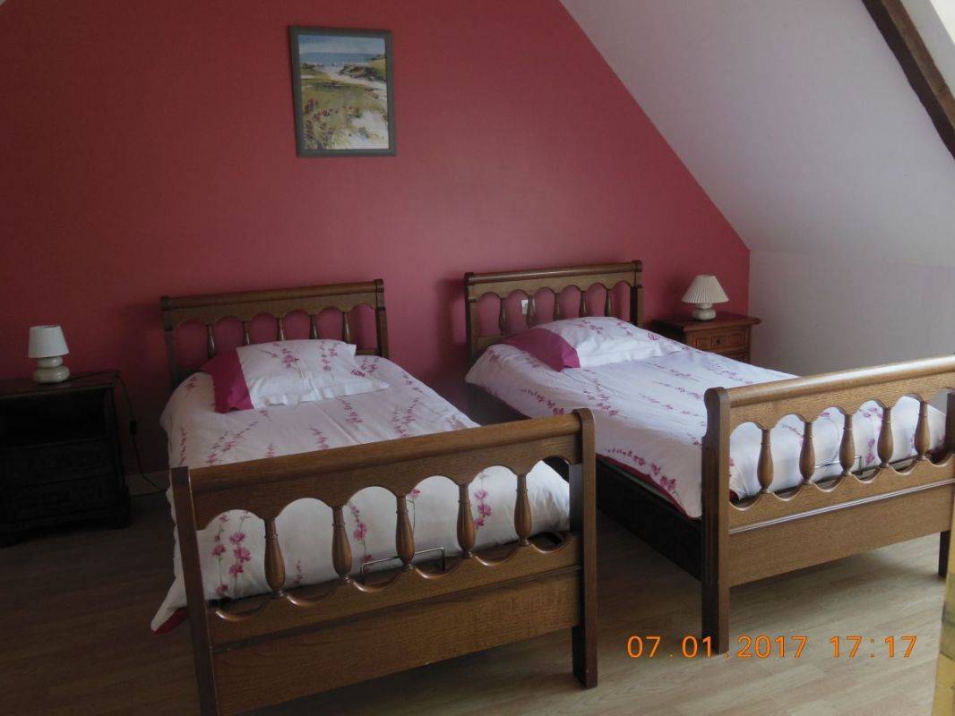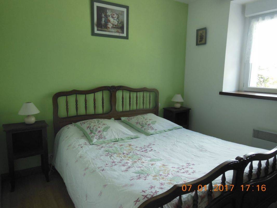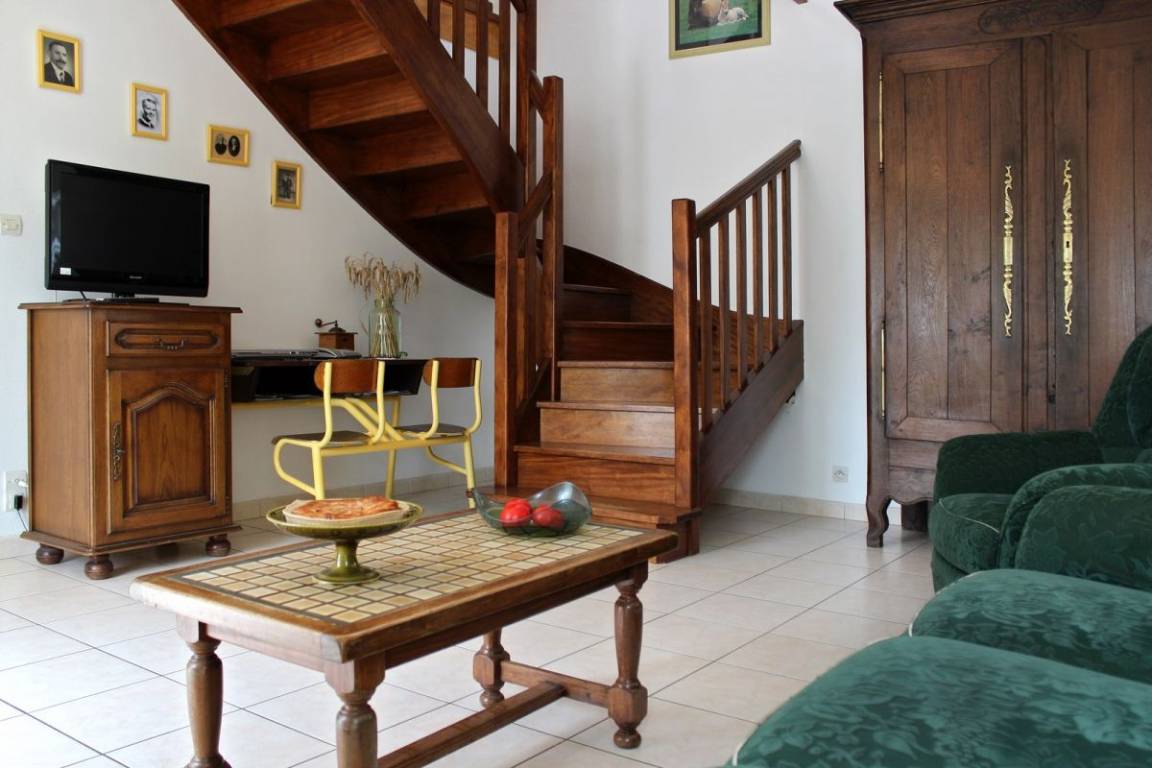 Ferienhaus neben 2 Vermitungen, in einem Betrieb mit Schweinehaltung. Terrasse und Garten (140 m²). Erdgeschoss : Wohnzimmer mit Küchenecke, 1 Schlaf-Zi (1 Doppelbett 160x190), Bade-Zi und WC. Stock : 2 Schlaf-Zi (4 Einzelbetten), Bade-Zi und WC. Babymaterial. TV, DVD player.