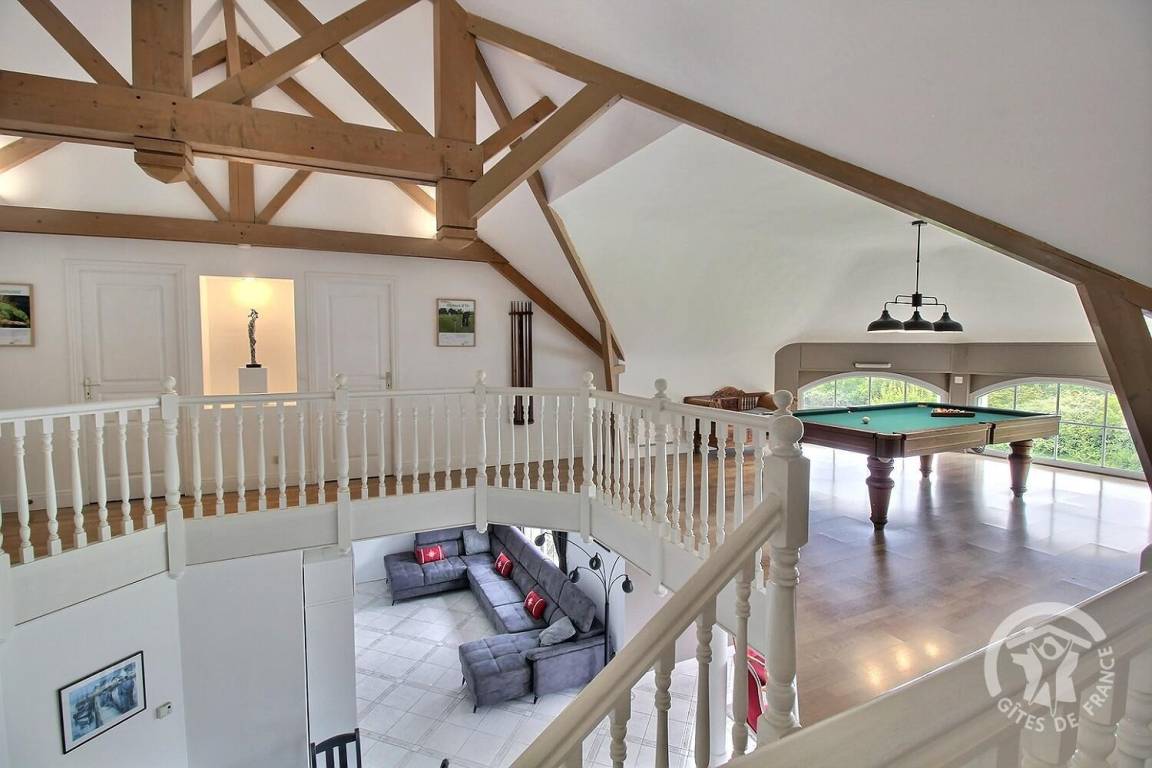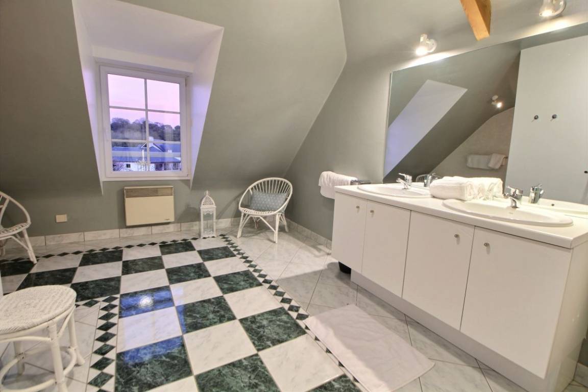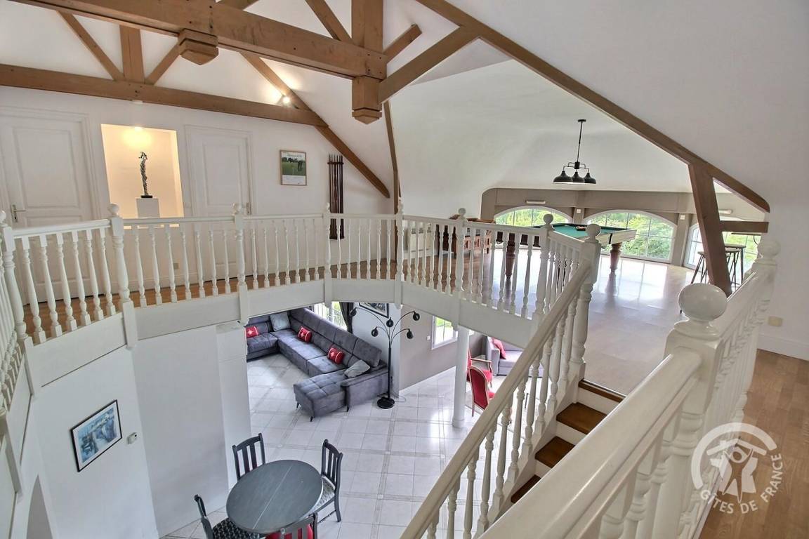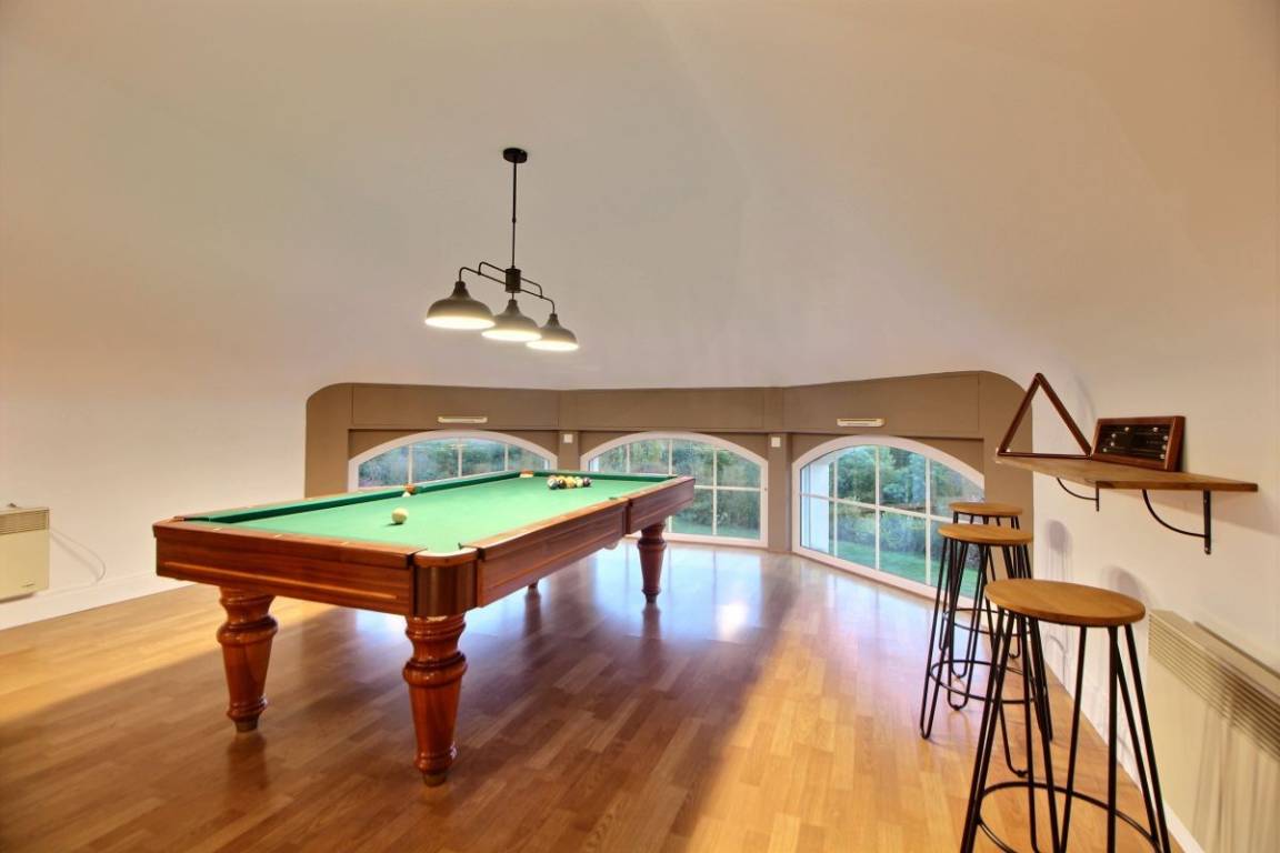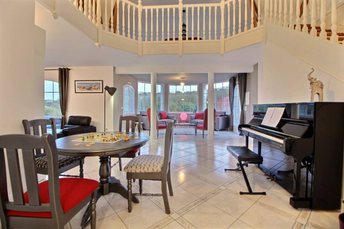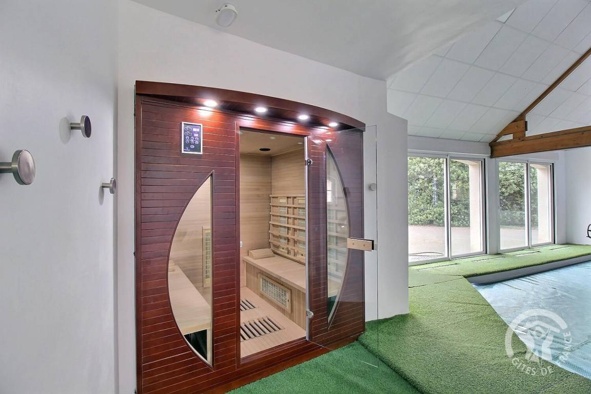 Dieses Ferienhaus bietet: Im Erdgeschoss: eine Diele mit separatem WC, 2 schöne helle Wohnzimmer mit Spieltisch und Klavier, Pelletofen, Esszimmer und angenehme Einbauküche, Waschküchenbereich, eine Zen Schlafzimmer-Suite mit 1 Zimmer (1 Bett 160x200), einem weiteren Zimmer (1 Bett 90x200), großem Badezimmer (mit Badewanne und Dusche) und ein WC. Im Obergeschoss: Prächtiges Zwischengeschoss, überhängend auf das Wohnzimmer mit Billardtisch, zu 2 Einheiten führend, jede mit 2 Schlafzimmern, die ihre eigene Badezimmer mit Dusche haben. In der Einheit Nature 1 Schlafzimmer (mit 1 Bett 160x200) und 1 Schlafzimmer (mit 2 Betten 90x200). In der Einheit Romantique 1 Schlafzimmer (mit 1 Bett 160x200) und 1 Schlafzimmer (mit 2 zusammenstellenden Einzelbetten), separate Toiletten. 100 qm große Terrasse von den 2 Wohnzimmern und der Küche aus erreichbar, Whirlpool das ganze Jahr über verfügbar, großes Landschaftsgrundstück mit Trampolin, Tennisplatz zur gemeinsamen Nutzung mit den Eigentümern und