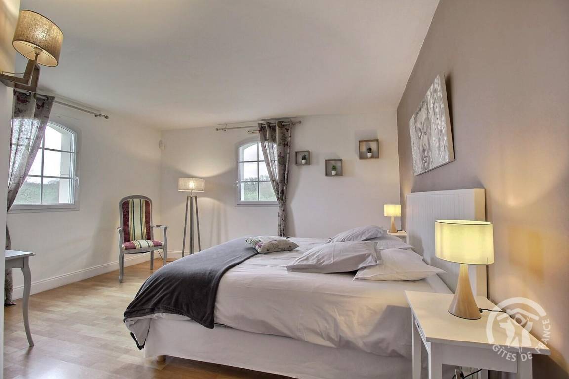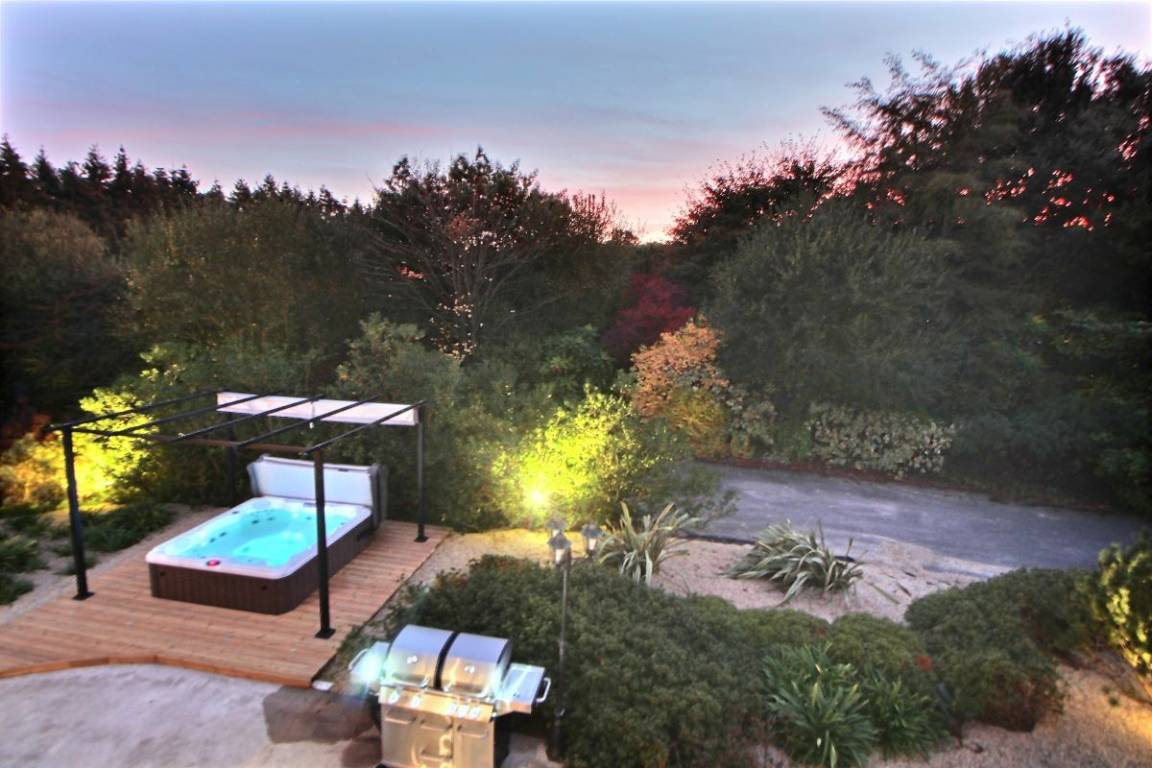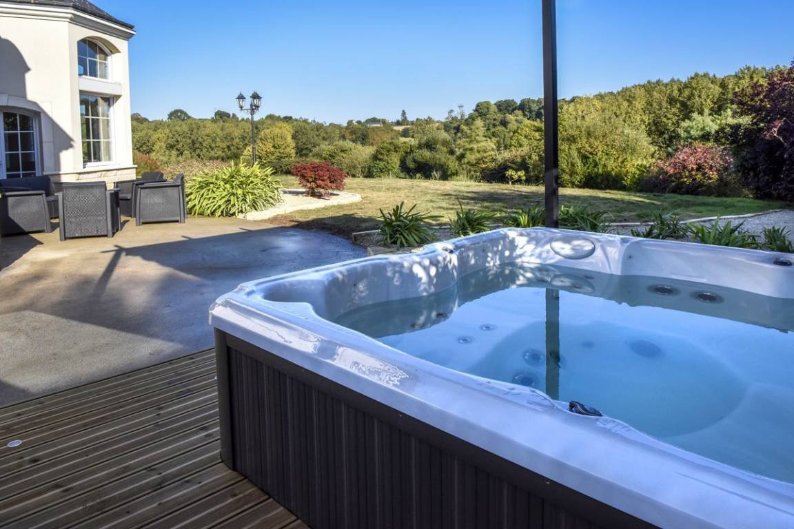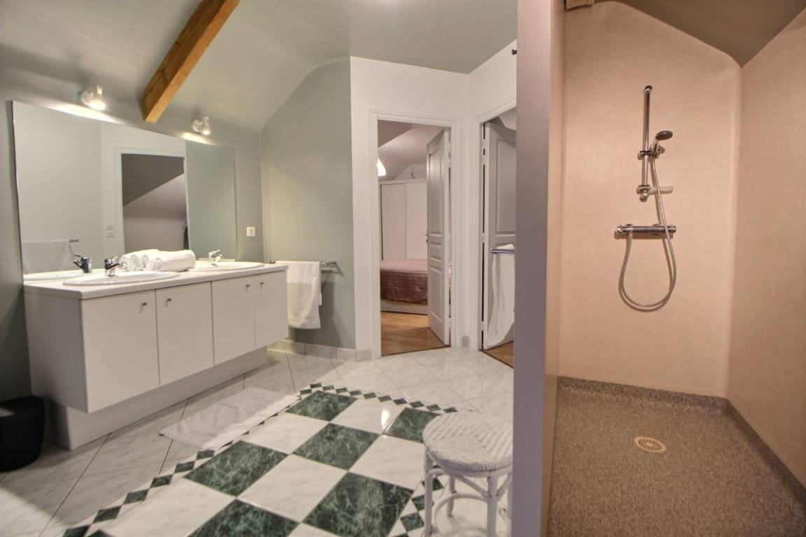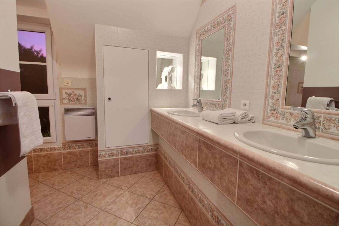 Dieses Ferienhaus bietet: Im Erdgeschoss: eine Diele mit separatem WC, 2 schöne helle Wohnzimmer mit Spieltisch und Klavier, Pelletofen, Esszimmer und angenehme Einbauküche, Waschküchenbereich, eine Zen Schlafzimmer-Suite mit 1 Zimmer (1 Bett 160x200), einem weiteren Zimmer (1 Bett 90x200), großem Badezimmer (mit Badewanne und Dusche) und ein WC. Im Obergeschoss: Prächtiges Zwischengeschoss, überhängend auf das Wohnzimmer mit Billardtisch, zu 2 Einheiten führend, jede mit 2 Schlafzimmern, die ihre eigene Badezimmer mit Dusche haben. In der Einheit Nature 1 Schlafzimmer (mit 1 Bett 160x200) und 1 Schlafzimmer (mit 2 Betten 90x200). In der Einheit Romantique 1 Schlafzimmer (mit 1 Bett 160x200) und 1 Schlafzimmer (mit 2 zusammenstellenden Einzelbetten), separate Toiletten. 100 qm große Terrasse von den 2 Wohnzimmern und der Küche aus erreichbar, Whirlpool das ganze Jahr über verfügbar, großes Landschaftsgrundstück mit Trampolin, Tennisplatz zur gemeinsamen Nutzung mit den Eigentümern und