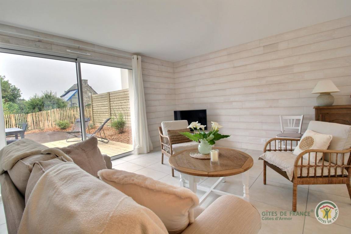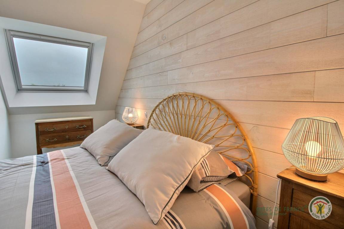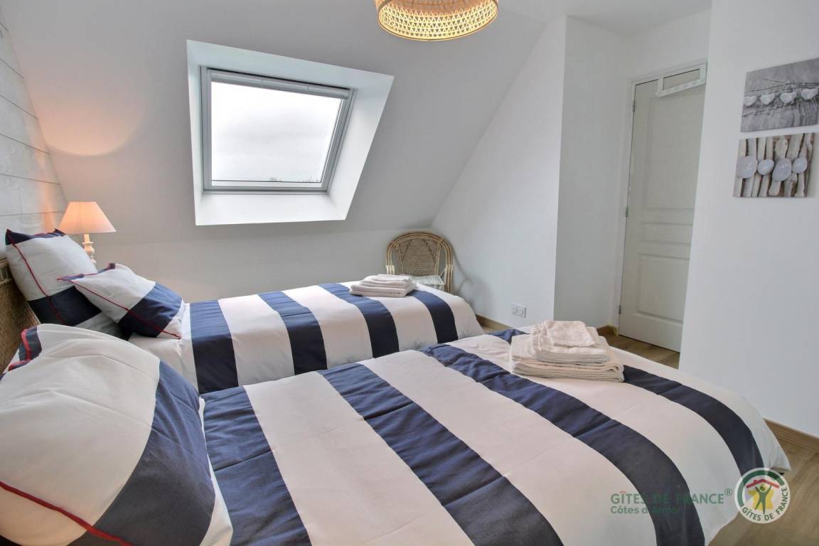 Ihre Ferienwohnung umfasst im Erdgeschoss: Küche, Wohnzimmer, WC, Waschküche. Obergeschoss mit Meerblick: 2 Schlafzimmer (1 Doppelbett 160x200) (2 Einzelbetten 90x200), Badezimmer mit Dusche, WC. Zu Ihrer Verfügung: eine private Terrasse von 20 m², ein privater Garten von 80 m² (Rasen wird angehoben). Parken Ihrer Fahrzeuge im privaten Innenhof der Unterkunft. Die Unterkunft liegt in einem Wohngebiet, angrenzend an die Gite 22G131727.