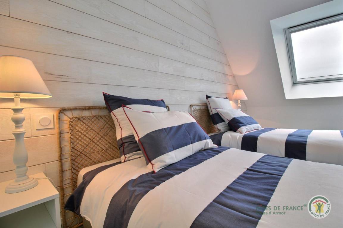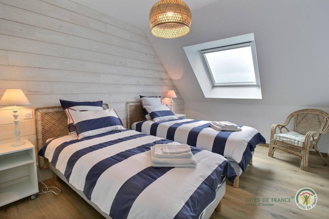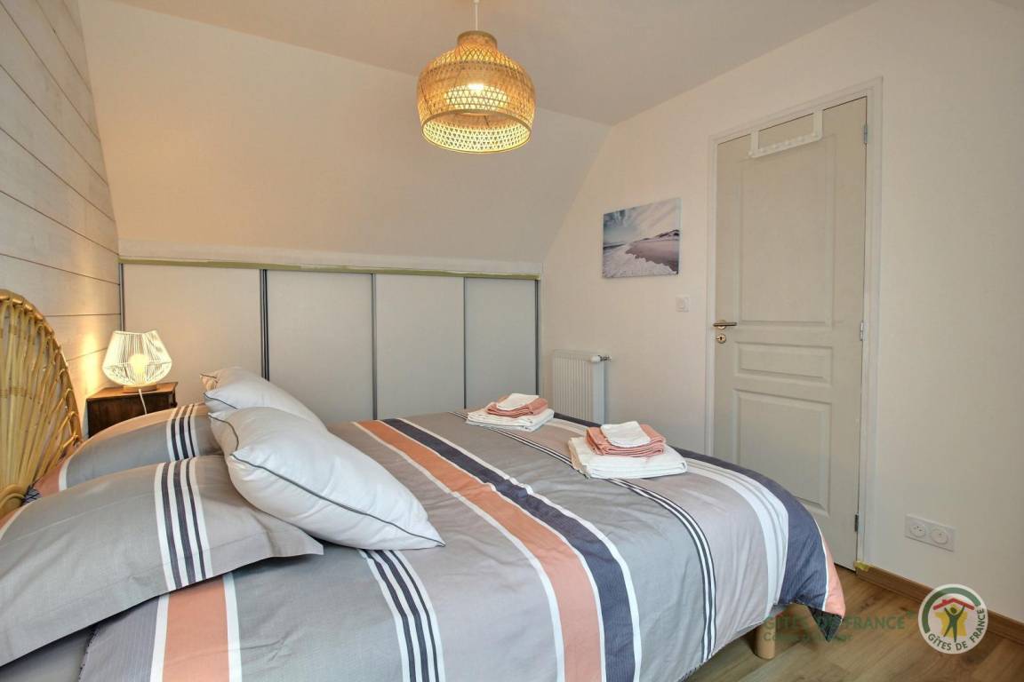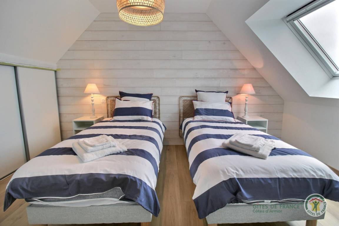 Ihre Ferienwohnung umfasst im Erdgeschoss: Küche, Wohnzimmer, WC, Waschküche. Obergeschoss mit Meerblick: 2 Schlafzimmer (1 Doppelbett 160x200) (2 Einzelbetten 90x200), Badezimmer mit Dusche, WC. Zu Ihrer Verfügung: eine private Terrasse von 20 m², ein privater Garten von 80 m² (Rasen wird angehoben). Parken Ihrer Fahrzeuge im privaten Innenhof der Unterkunft. Die Unterkunft liegt in einem Wohngebiet, angrenzend an die Gite 22G131727.