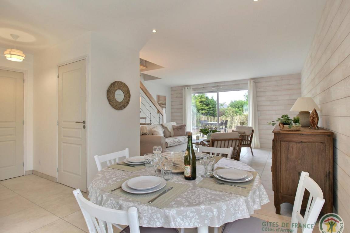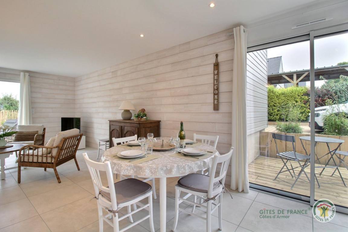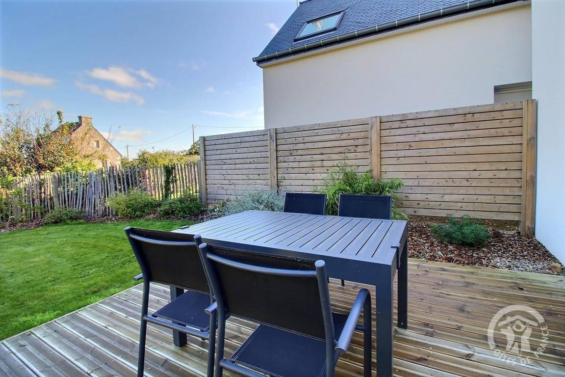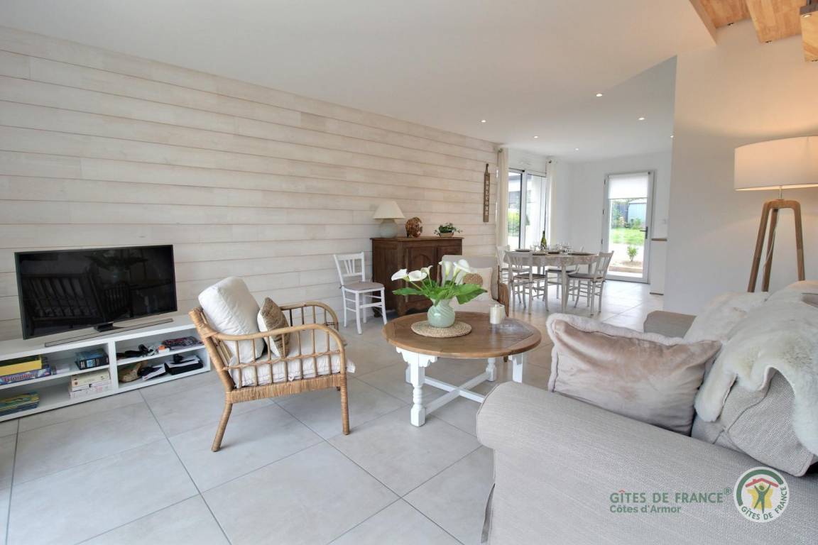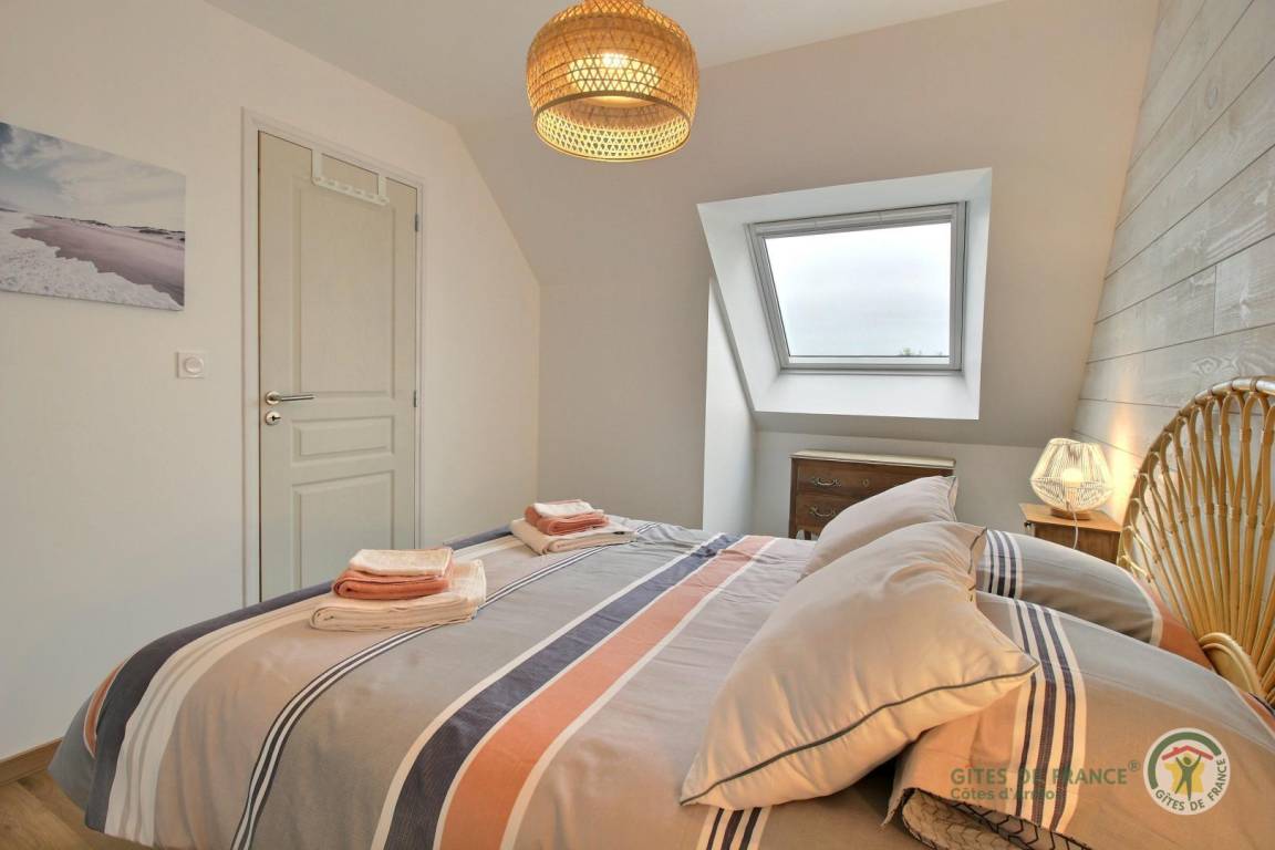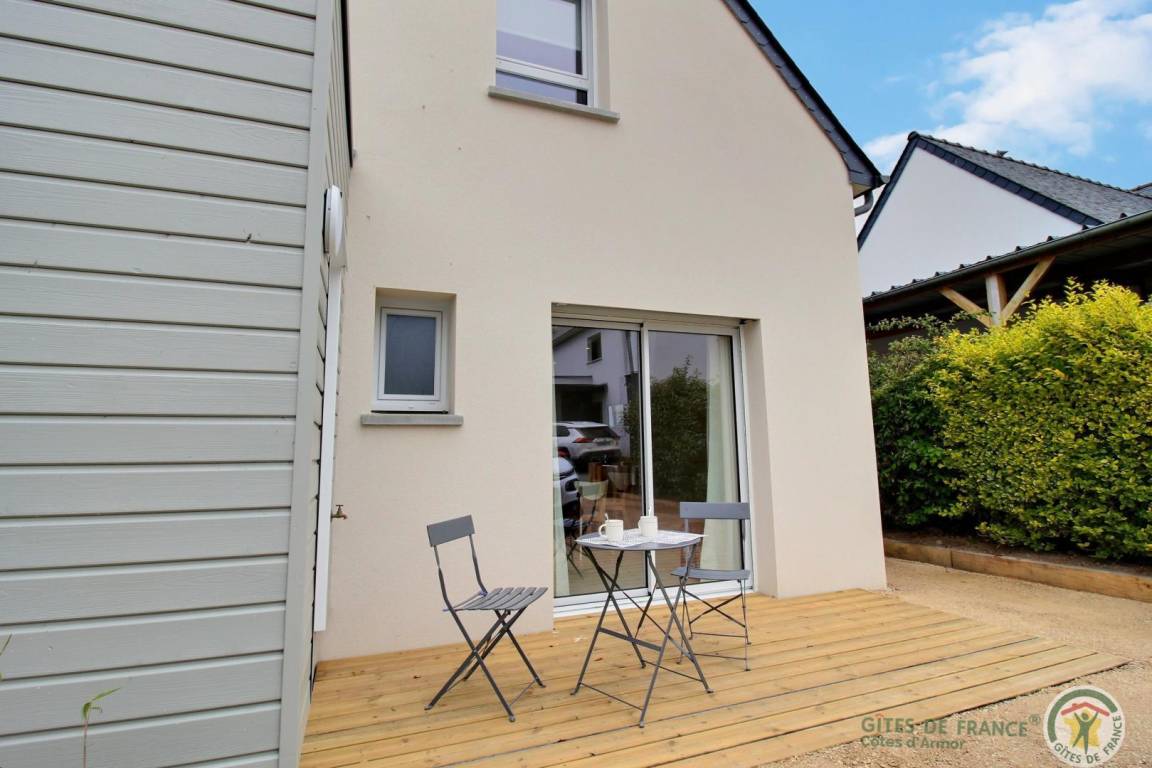 „Nous avons passé une très bonne semaine à Trélévern dans cette maison neuve décorée avec goût !Tout a commencé par l'accueil convivial du propriétaire qui nous a fait un état des lieux de la maison et des visites à envisager pendant notre séjour. Une petite attention était prévue lors de notre arrivée afin de goûter aux spécialités locales. La maison possède tout le nécessaire pour s'y sentir comme chez soi. Elle est optimisée afin de ne rien manquer. Salle à manger spacieuse pour 4 personnes, cuisine équipée avec micro-onde, plaque à induction, grand four et 2 machines à café (filtre et Nespresso).1 chambre adulte, 1 enfant avec 2 lits, des jeux, des livres et beaucoup de rangements dans chacune d'entre elles. La cerise sur le gâteau avec la vue mer !Salle de bain spacieuse avec tout le nécessaire (serviettes, gants, sèche-cheveux) comprenant une douche, un plan vasque et un sèche-serviette. Un petit jardin avec terrasse en bois ainsi qu'une table de repas et ses chaises étaient à disposition pour déjeuner en terrasse sans aucun vis-à-vis. Également 2 transats pour se prélasser au soleil. Sans oublier le barbecue à gaz !L'endroit est très calme et truffé de jolies balades à faire grâce à la proximité immédiate de la plage de sable fin (environ 500 mètres).Ne pas oublier les raquettes de tennis pour les grands sportifs, car 2 cours (gratuits) sont à disposition immédiate de la maison. N'hésitez pas à rendre visite à la petite pépinière de plantes aromatiques située à 2 pas qui est tenue pas une personne charmante et passionnée. Merci encore pour l'accueil et l'hospitalité des propriétaires. Nous reviendrons avec grand plaisir.“