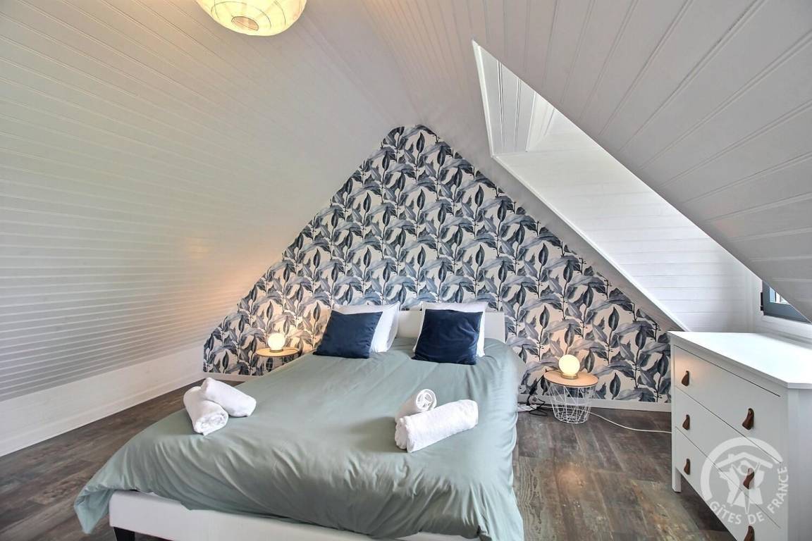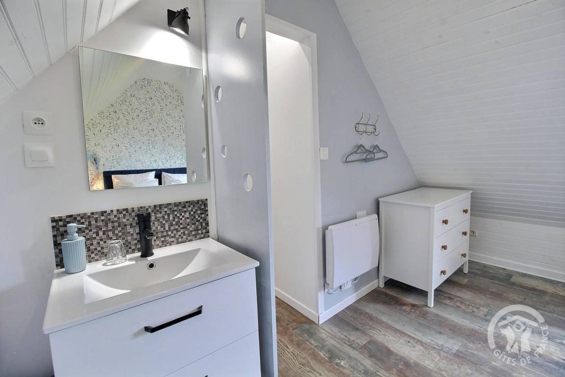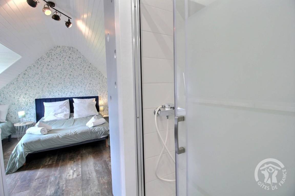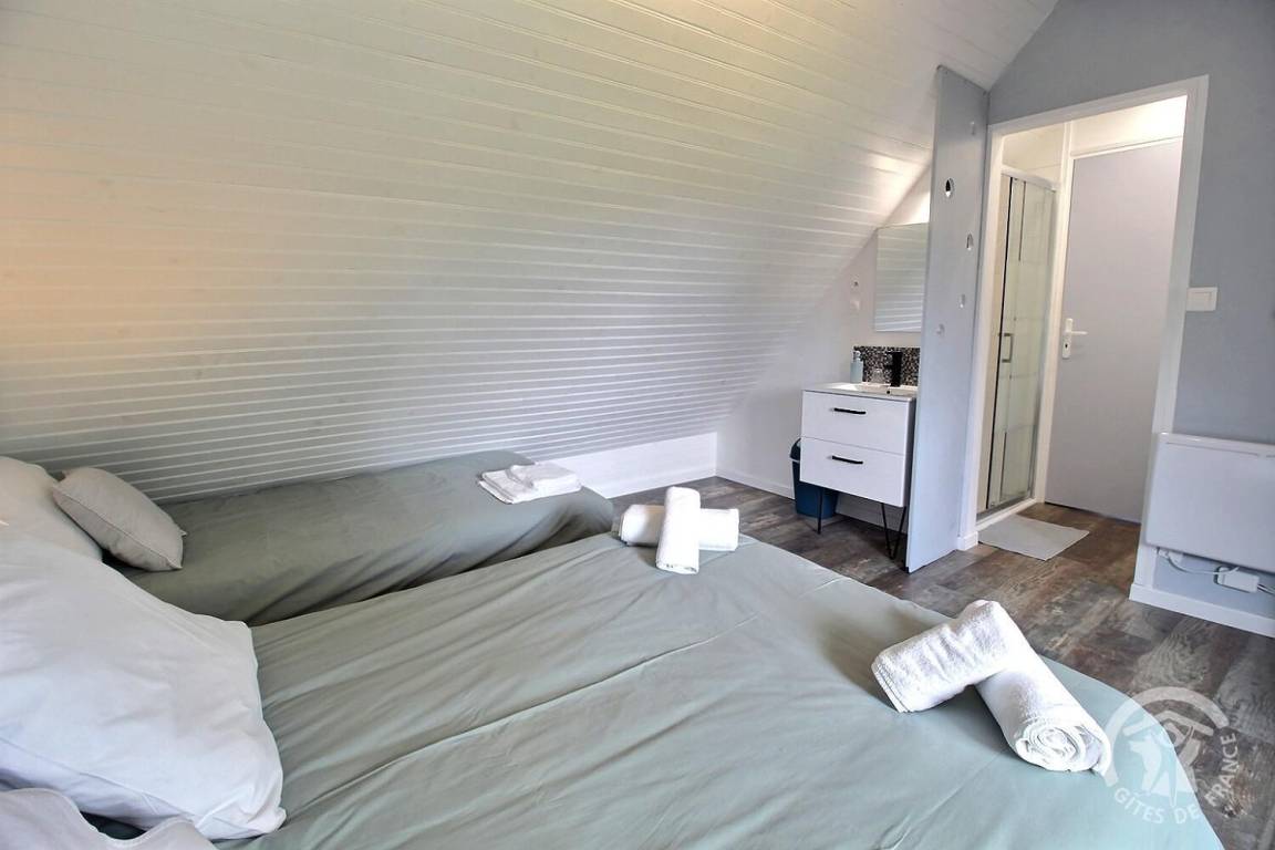 - Etage: ein Schlafzimmer (1 160x200-Bett) mit Zugang zu einem angrenzenden Badezimmer mit Dusche und WC, ein zweites Schlafzimmer (1 140x190-Bett, 2 90x190-Betten) mit Zugang zu einem Toiletten- und Duschbereich.