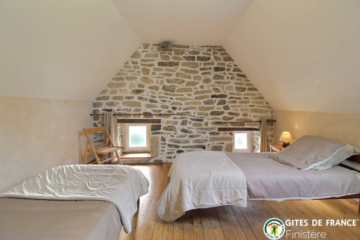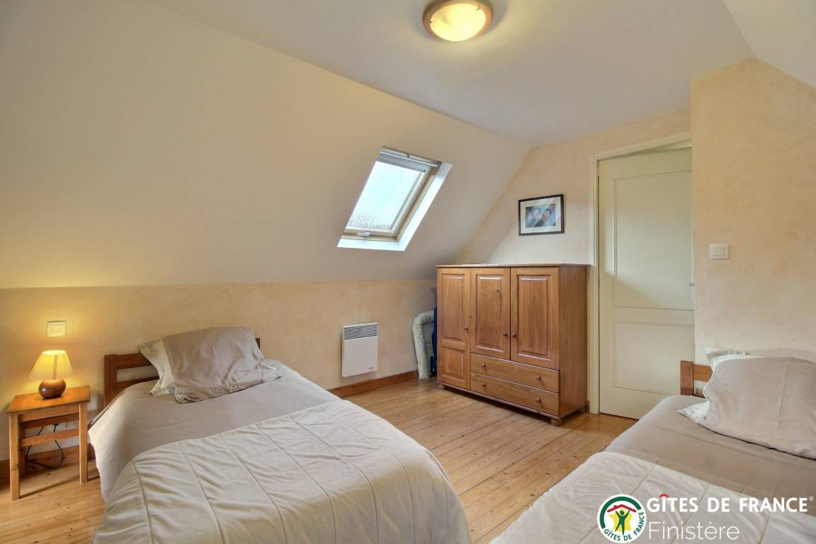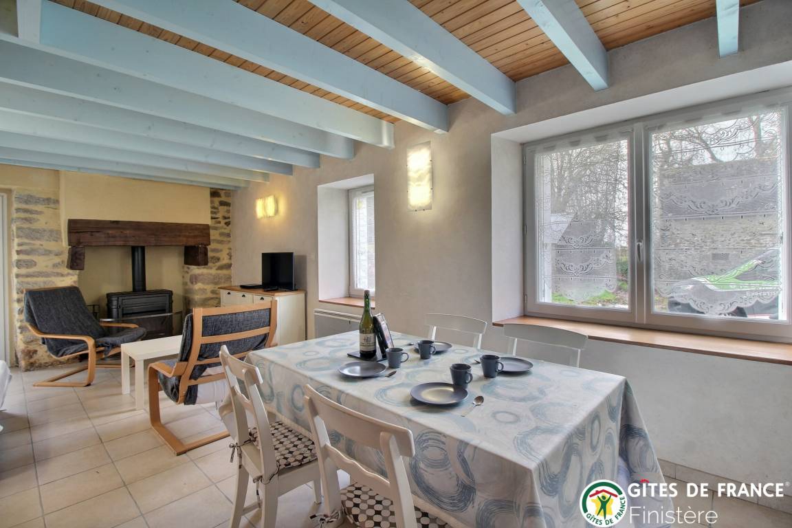 Freistehendes Haus im lokalen Stil zwischen Quimper und Pont-l'Abbé in der Nähe des Bio-Milchwirtschaft der Eigentümer und eines weiteren Gîtes. EG: Wohn-/Esszimmer mit Kochecke und Holzofen, sep. WC. 1.Stock: Doppelzimmer (Bettbreite 1.40m), Zweibettzimmer, Dusche. Wi-Fi. E-Heizung. Garten, Gartenmöbel, Grill.