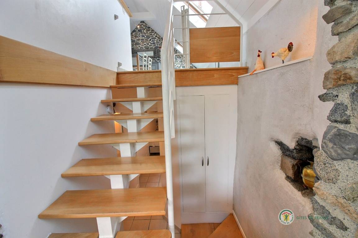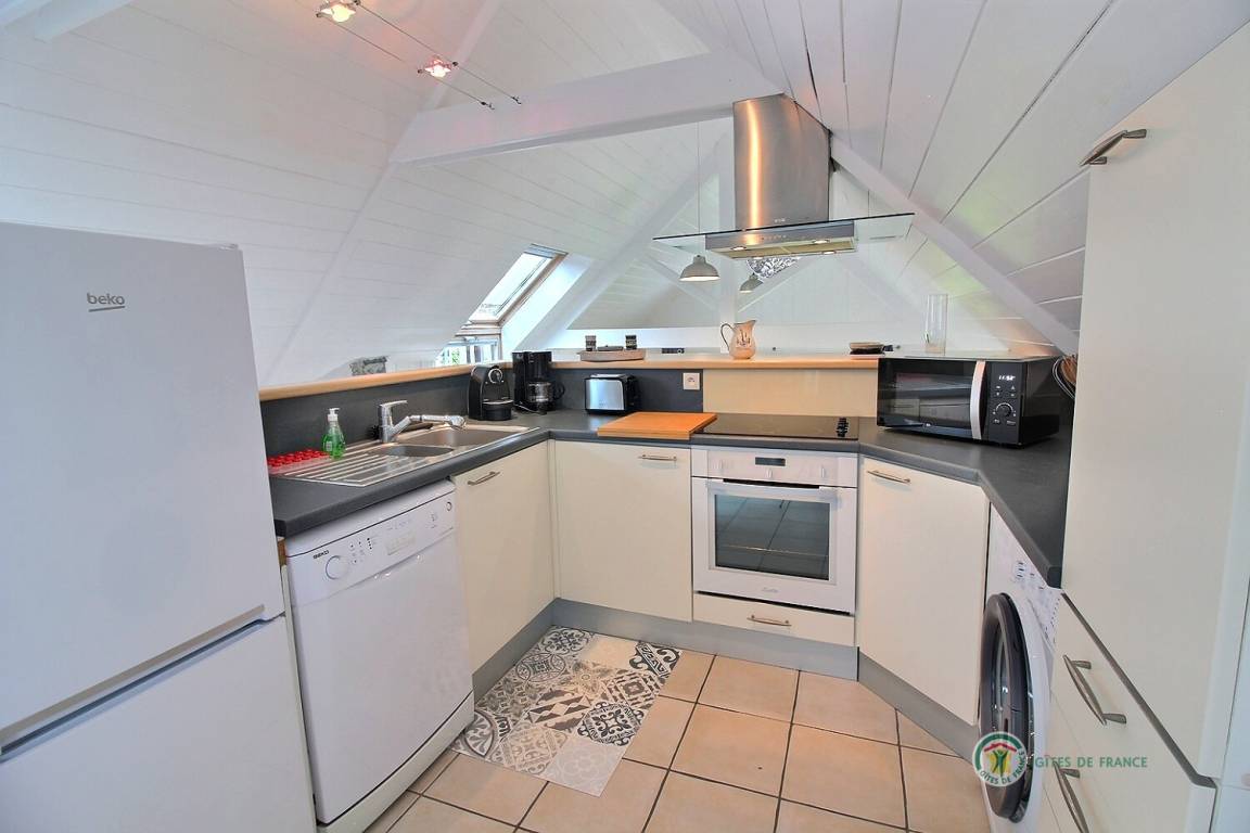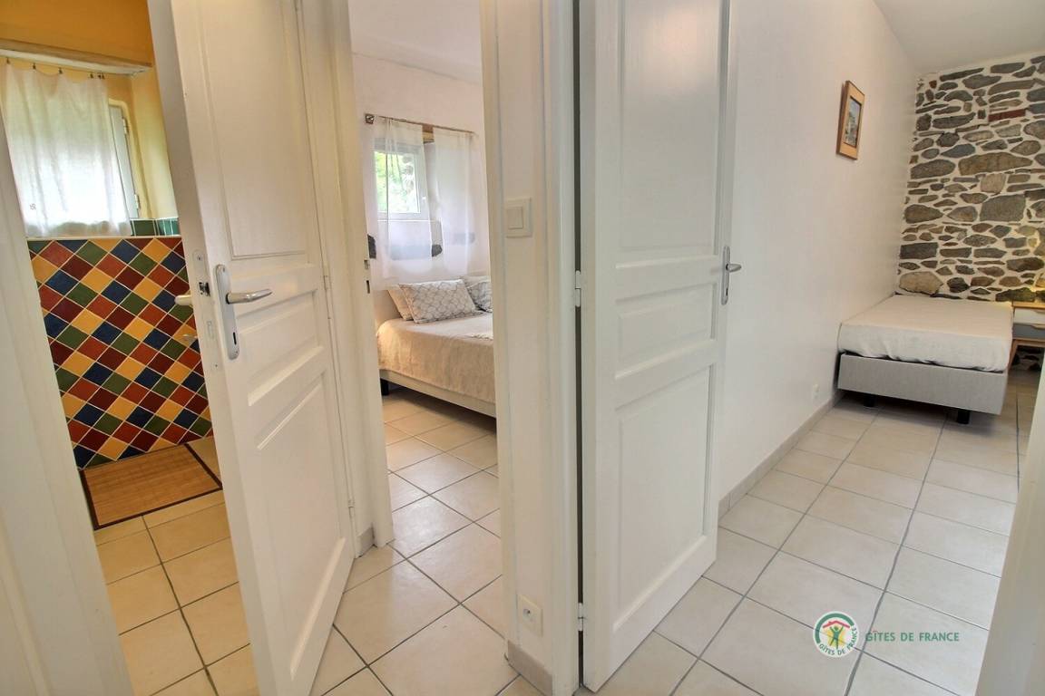 Ihre Ferienwohnung auf halber Ebene beinhaltet: Eingang durch das große Wohnzimmer, Wohnküche im Zwischengeschoss und über eine Treppe, die hinunter zum Schlafbereich und zu den Badezimmern führt: 1 Schlafzimmer mit 1 160x200 Bett mit Zugang zu einer kleinen Außenterrasse, das andere Schlafzimmer mit 2 Betten 80x200 und Bad mit Dusche und separatem WC. 420 m² Garten mit Terrasse. Parken eines einzelnen Fahrzeugs auf dem Grundstück.