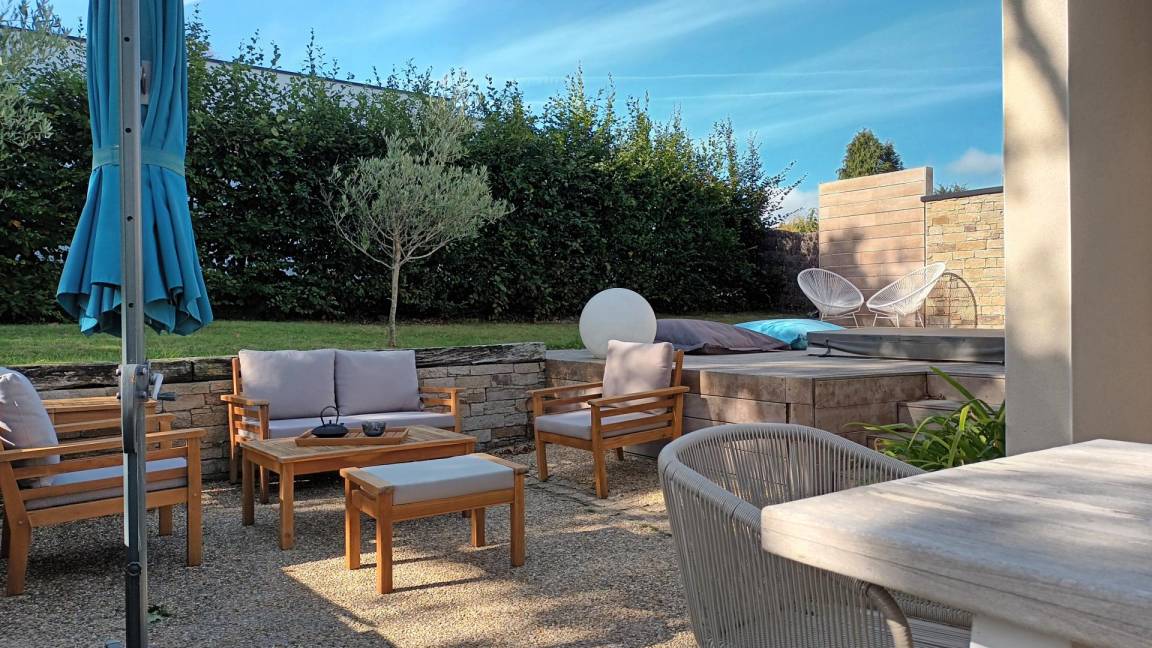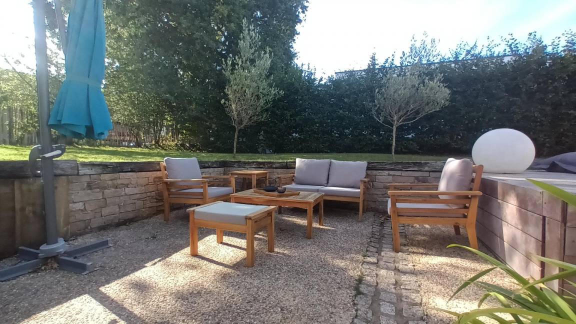„Ameublement chaises et fauteuils fatigués. Quartier tranquille, agréable. Malgré une météo plutôt fraîche, maison récente donc confortable.“