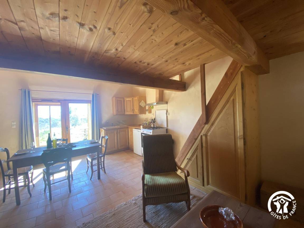 Wohnzimmer mit Küche, Sitzecke (Doppelschlafsofa), Kaminofen und Zugang zu einem kleinen Garten mit privater, nicht umzäunter Terrasse, die mit Gartenmöbeln, Bänken und einem Holztisch ausgestattet ist.