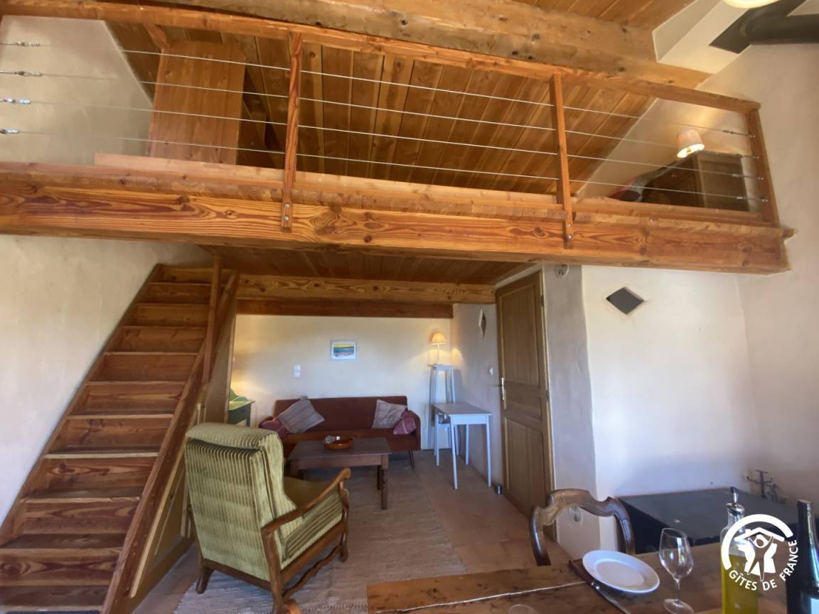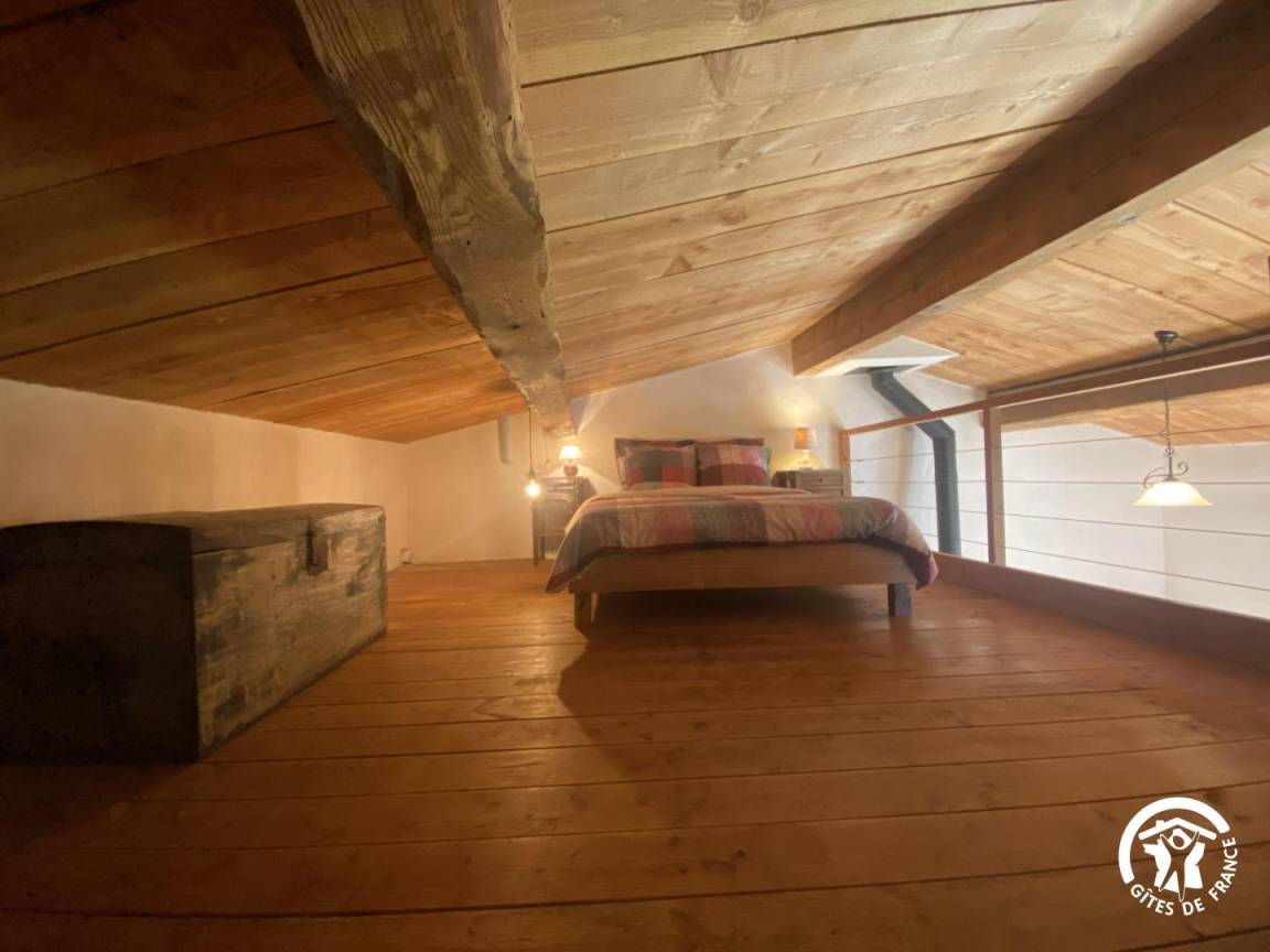 Eine steile, schmale Treppe führt zum Zwischengeschoss mit Blick auf das Wohnzimmer. Hier befindet sich ein Doppelbett (140 x 190 cm). Aufgrund baulicher Gegebenheiten ist die Decke niedrig.