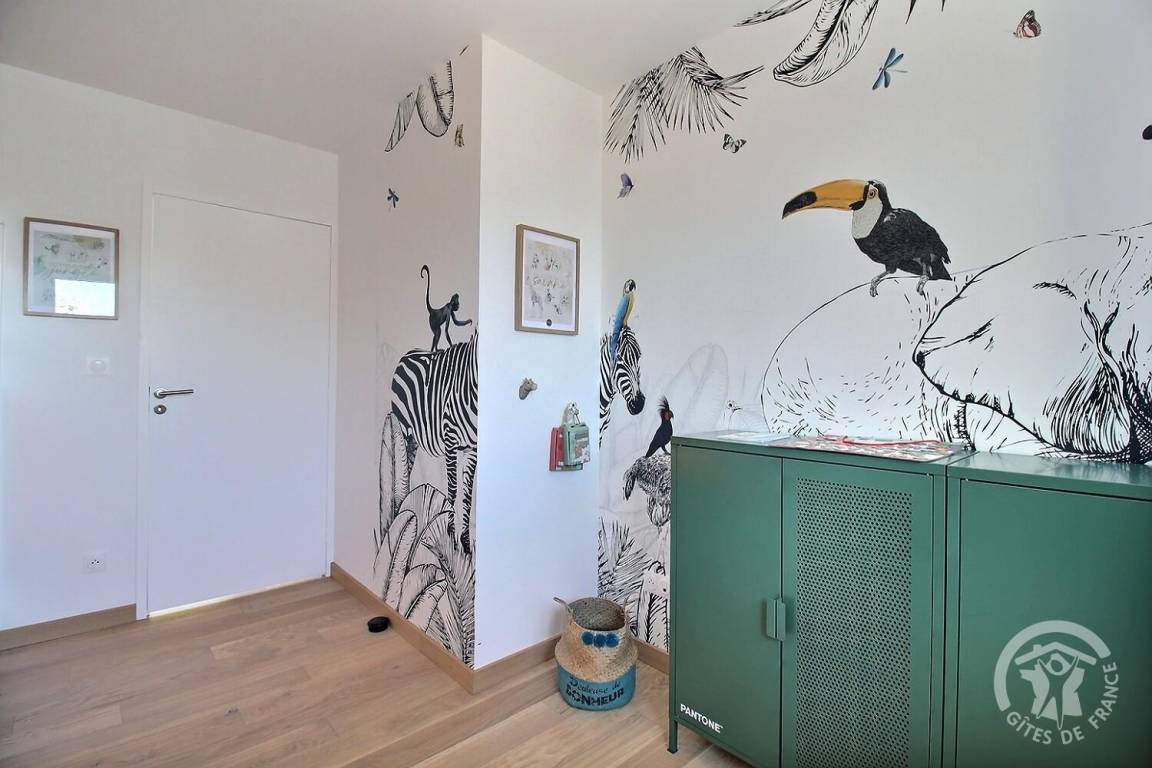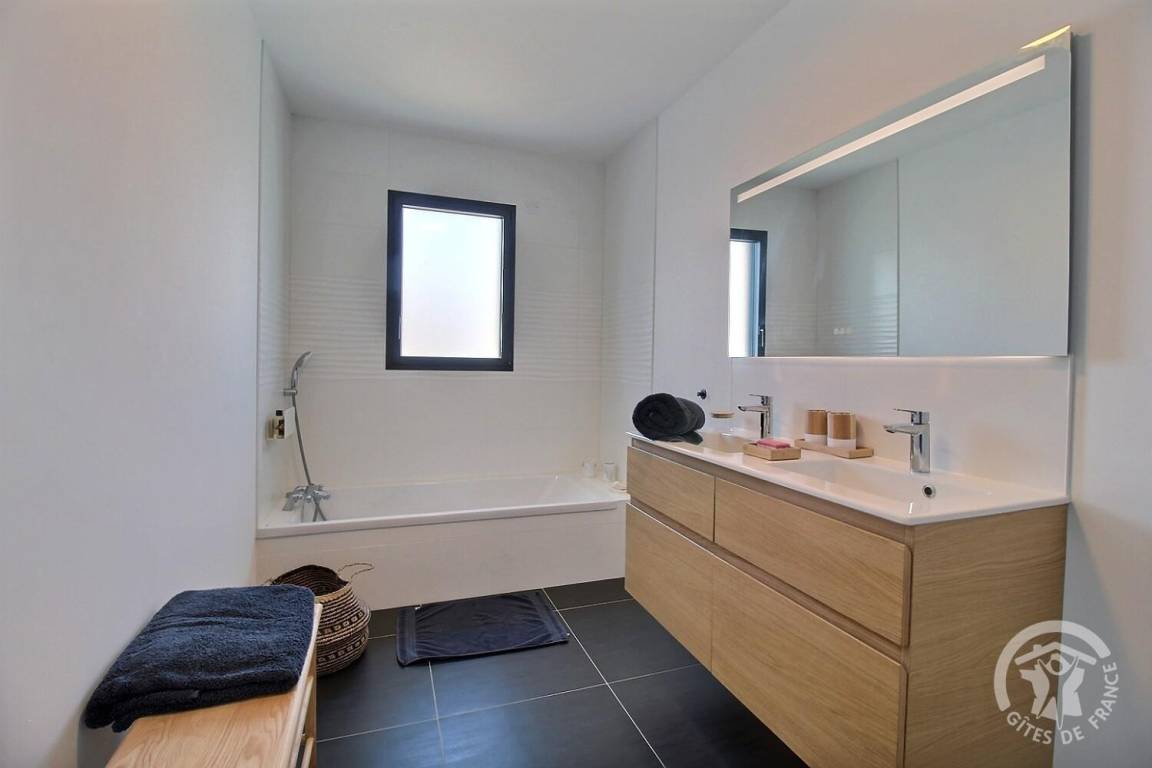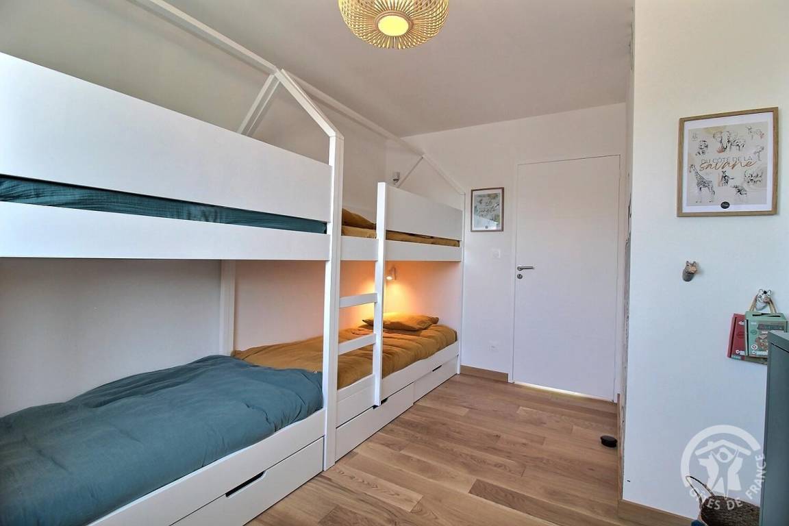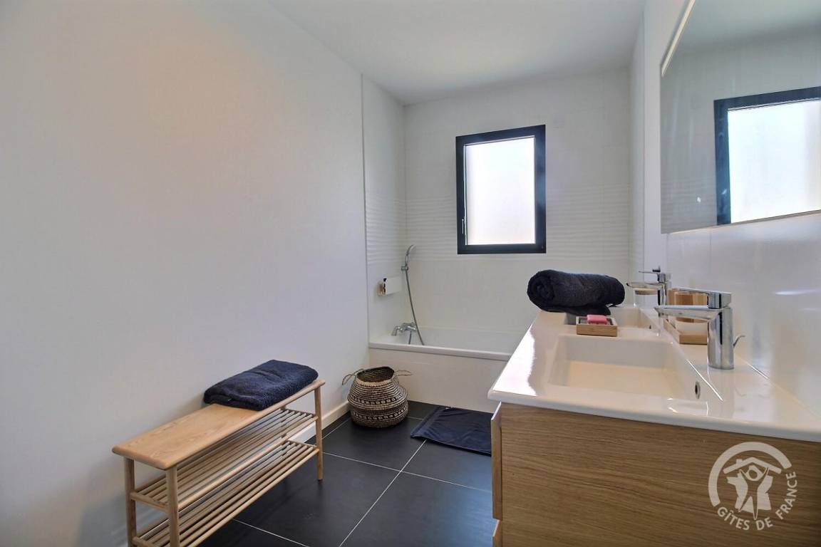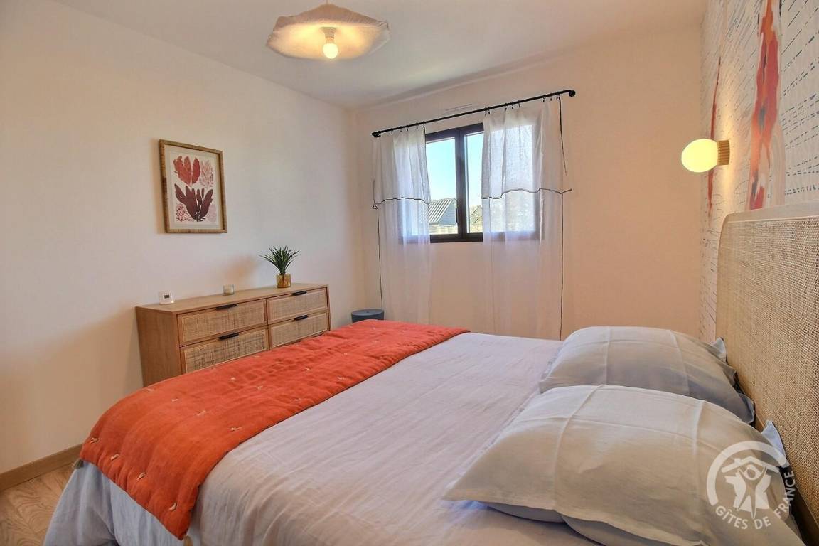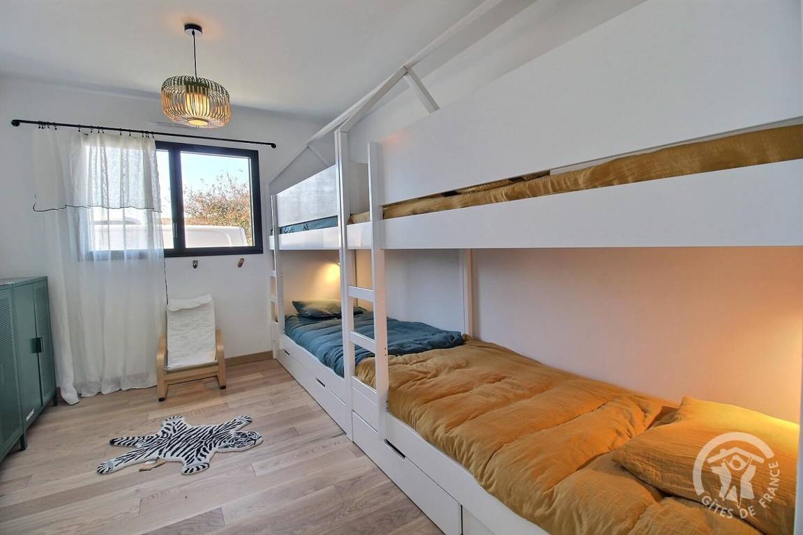 Es umfasst: eine Küche, ein Wohnzimmer, eine Waschküche, ein Badezimmer mit Badewanne und WC, ein erstes Schlafzimmer (4 Etagenbetten 90 x 190), ein zweites Schlafzimmer (1 Bett 140 x 190), ein drittes Schlafzimmer (1 Bett 160 x 200) mit eigenem Bad inklusive Dusche und WC.