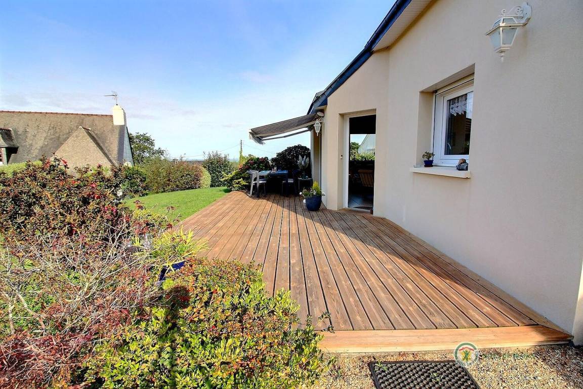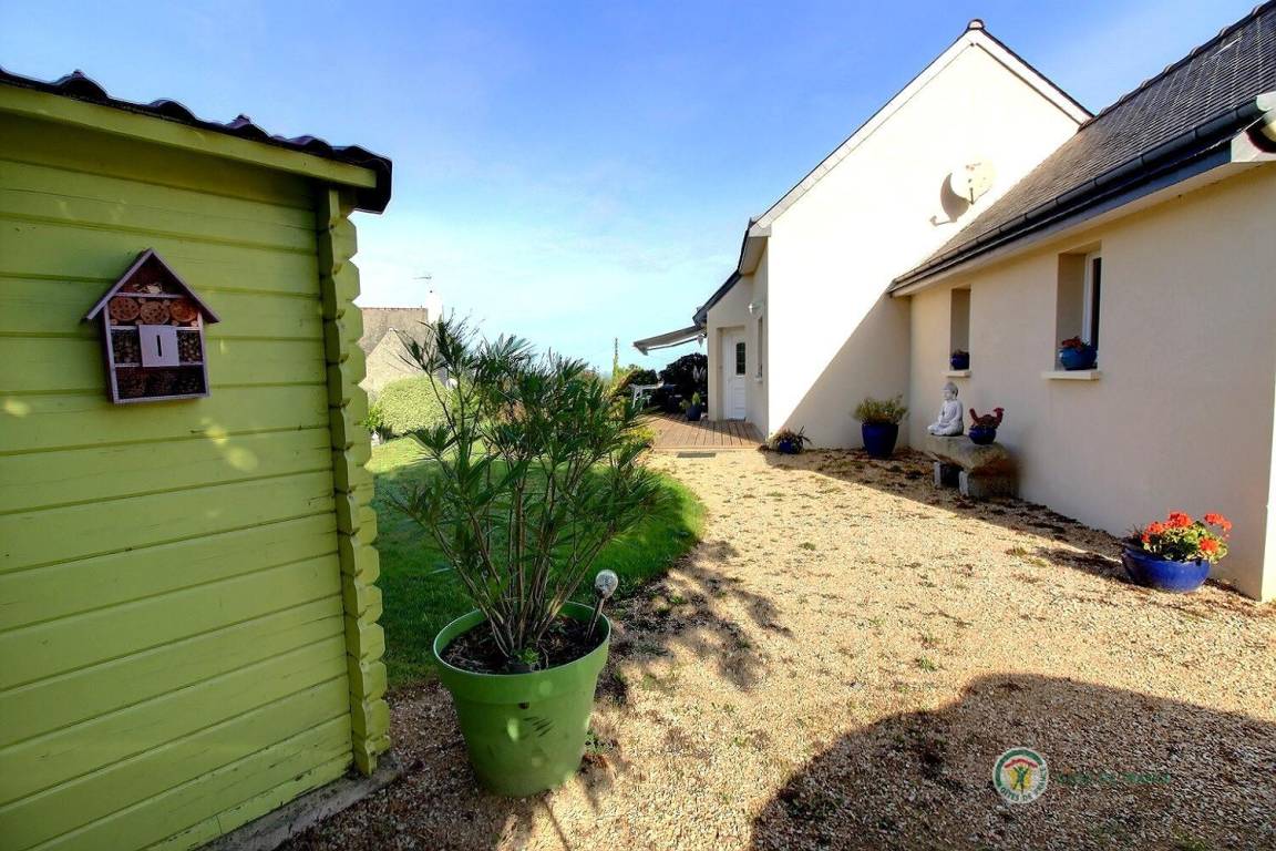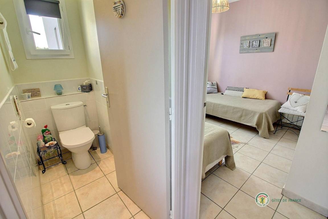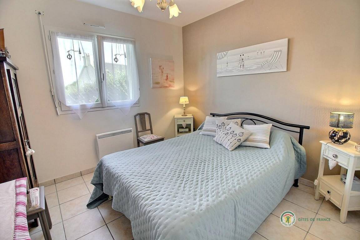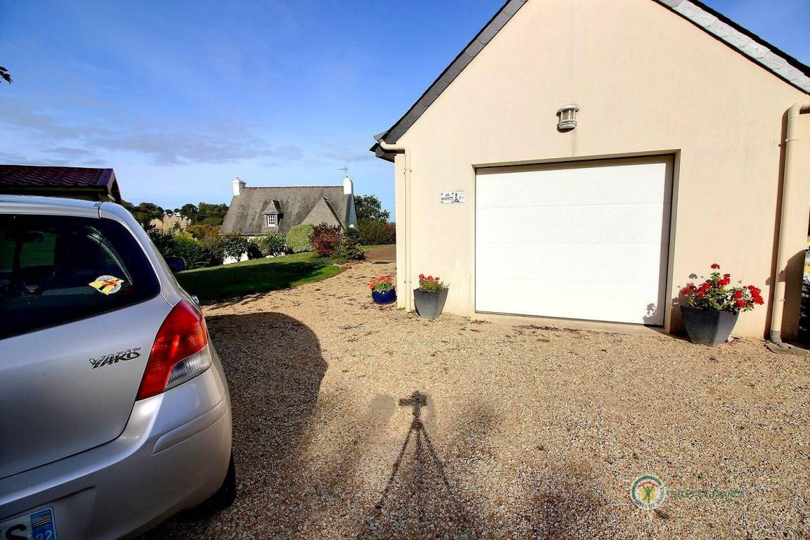 Dieses Ferienhaus umfasst : Im Erdgeschoss : eine voll ausgestattete Küche mit Öffnung zu einem Ess-Wohnsalon mit Blick auf das Meer in der Ferne. Zwei Zimmer (1 Bett 140x190) (2 Einzelbetten 90x190), ein Badezimmer, separates WC. Garten von 800 m². Terrasse von 40 m². Parkmöglichkeit auf dem Anwesen, Garage verfügbar.