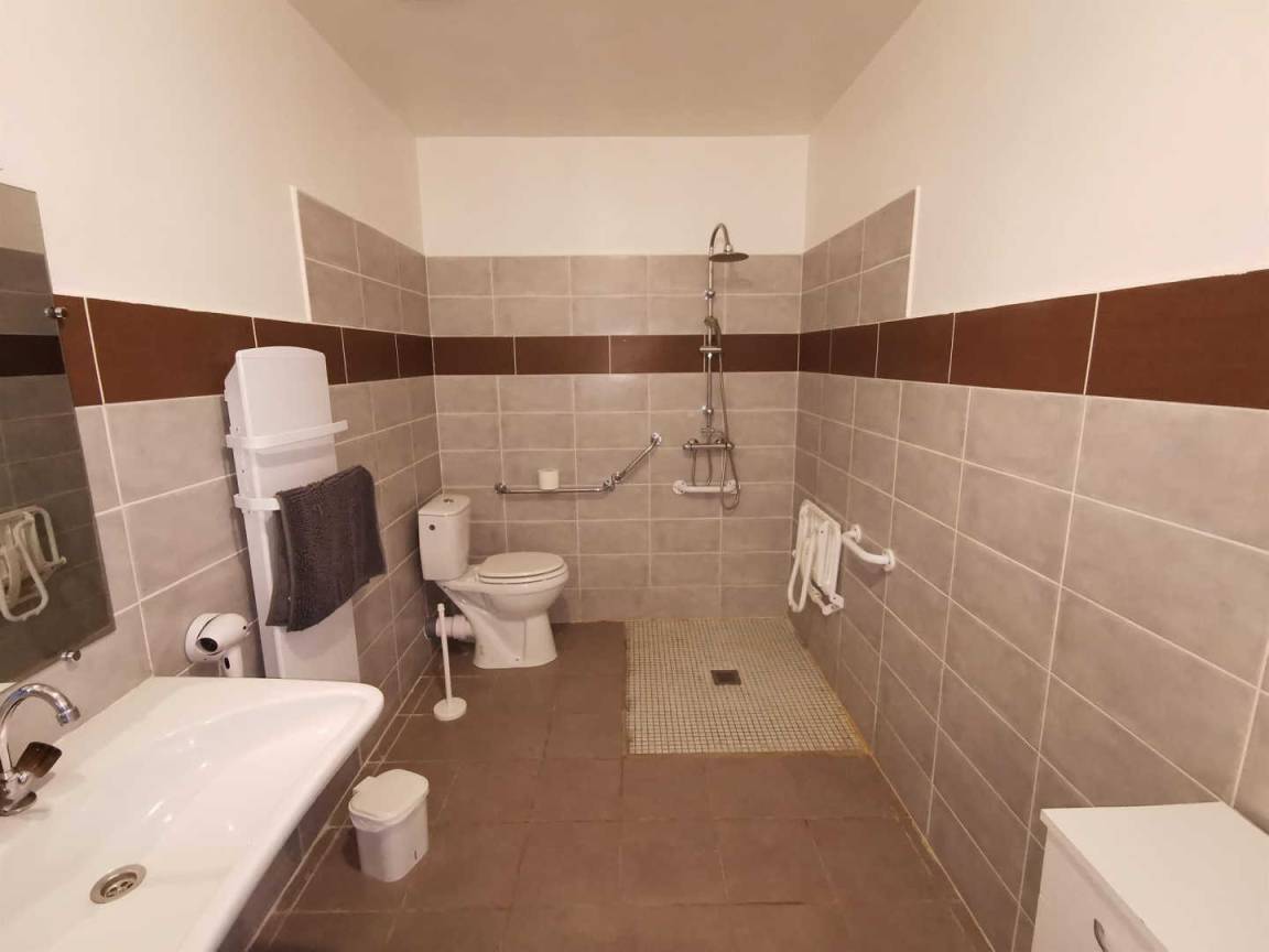 „De nombreux détails sont à revoir pour les adaptations PMR, le lave linge est notamment trop prêt des toilettes et ne permet pas de placer correctement le fauteuil. Le deuxième toilette est aussi difficile d'accès pour une personne en fauteuil. Les barres dans la douche sont mal positionnées, car il faut obligatoirement rentrer dans la douche avec le fauteuil pour accéder aux barres. Aussi les cailloux et un fauteuil, ce n'est pas forcément top…Côté propreté, beaucoup de toiles d'araignées, four qui n'a pas été nettoyé (avec des aliments collés dans le four), …“