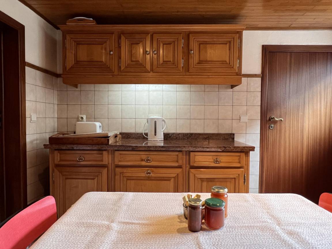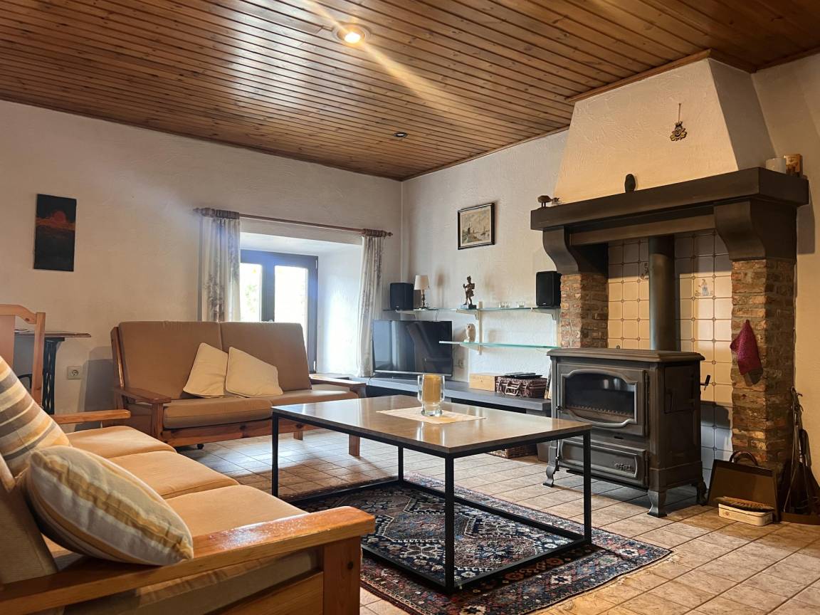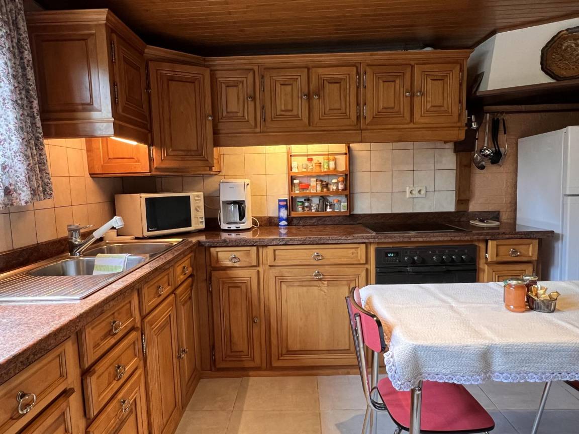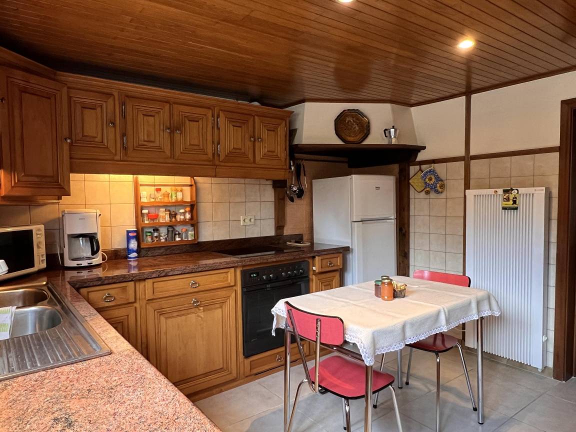 Layout : Parterre: Eingang, Wohnzimmer mit TV, Esstisch(6 Personen), Ofen(Holz), Sitzecke, Radio, Gesellschaftsspiele, Spielzeug , Küche mit Wasserkocher, Toaster, Kochherd, Dunstabzugshaube, Kaffeemaschine(Filter), Backofen, Mikrowelle, Geschirrspüler, Kühl-/Gefrierkombination, Mixer, Stabmixer , Toilette