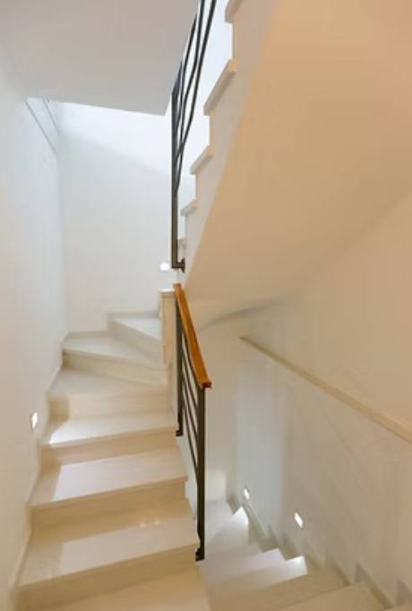 Das Haus verfügt über eine schmale, aber gut beleuchtete Treppe mit Handlauf und die Stockwerke können nur über Stufen bestiegen werden.