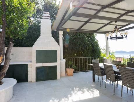 Sobald Sie es sich gemütlich gemacht haben, werden Sie diese idyllische Terrasse nicht mehr verlassen wollen. Ein schattiger Esstisch lädt zum Frühstück mit Vogelgezwitscher oder einem Glas Wein unter dem Sternenhimmel ein. Bringen Sie Ihre Urlaubslektüre mit und legen Sie die Füße hoch oder servieren Sie ein Festmahl, das Sie stundenlang zusammenbringt. Eine Steinspüle im Freien und ein gemauerter Ofen/Grill ermöglichen die Zubereitung im Freien. Der Blick auf rote Dächer, grüne Bäume und blaues Wasser ist das ganze Jahr über verlockend.